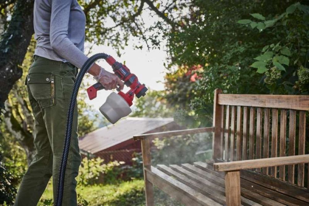 Акумуляторний фарборозпилювач Einhell TE-SY 18/90 Li - Solo із серії Power X-Change підходить для фарбування середніх і великих площ. Бак об'ємом 1200 мл забезпечує подачу фарби до 1000 мл/хв, працює з рідинами до 90 DIN-с. Регулювання кількості фарби, ширини та форми струменя (вертикальний, горизонтальний, круговий) дозволяє адаптувати розпилювач до різних завдань. Окрема повітродувна станція, ремінь і 1,8 м шланг роблять пристрій зручним. Відкидна кришка захищає акумулятор від забруднень. Знімна голівка й аксесуари для чищення спрощують догляд. У комплекті: бак із мірною шкалою, три сопла (1,5 мм, 2,5 мм, 3,0 мм), тестер в'язкості. Акумулятор і зарядний пристрій не входять до комплекту.