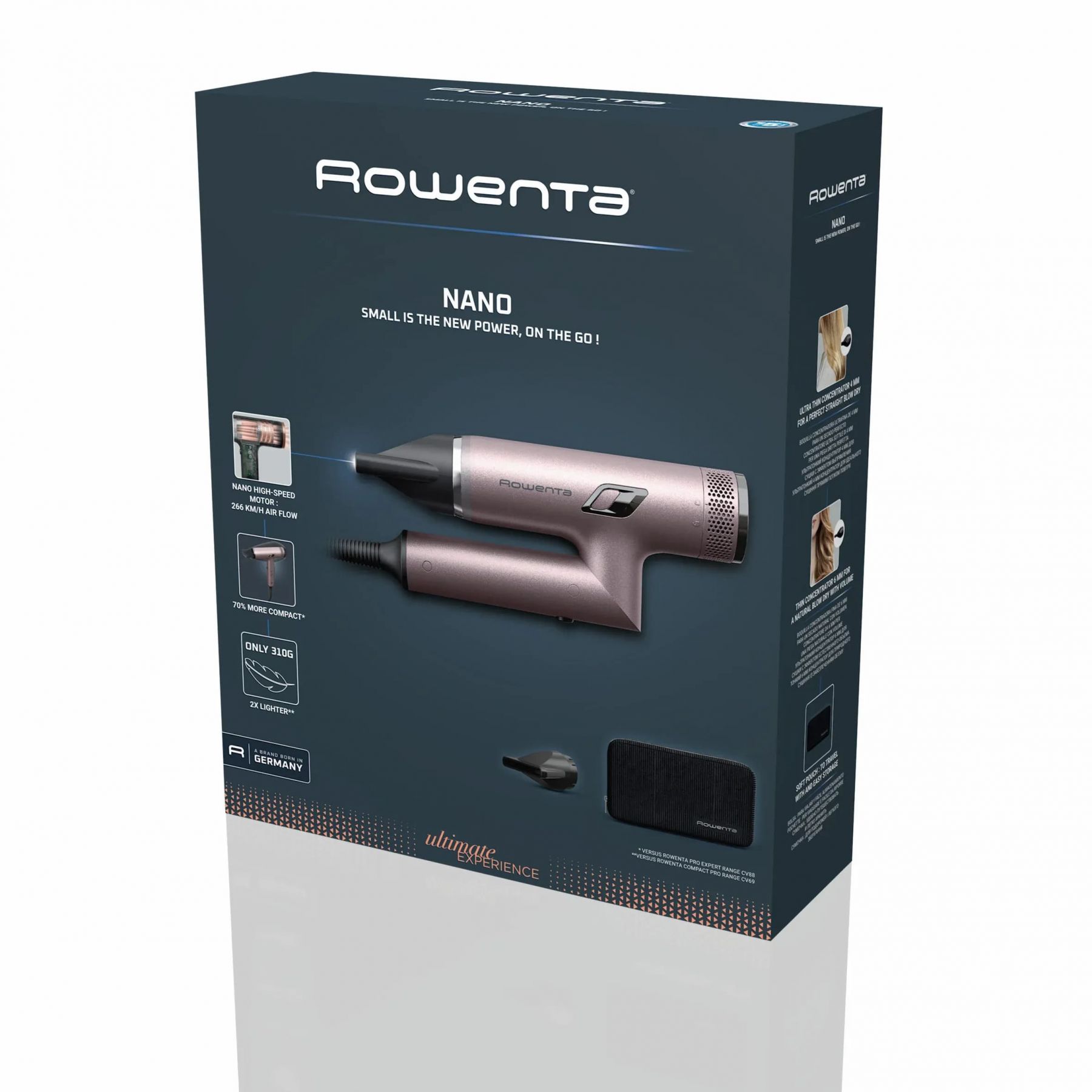 Rowenta Nano Foldable — складаний фен з цифровим мотором NANO Brushless та повітряним потоком до 266 км/год. Інструмент створений у компактному форматі та забезпечує швидке висушування волосся вдома й у подорожах. У наборі два концентратори, а також футляр для зберігання та транспортування. Конструкція з малою вагою робить прилад зручним у щоденному використанні.