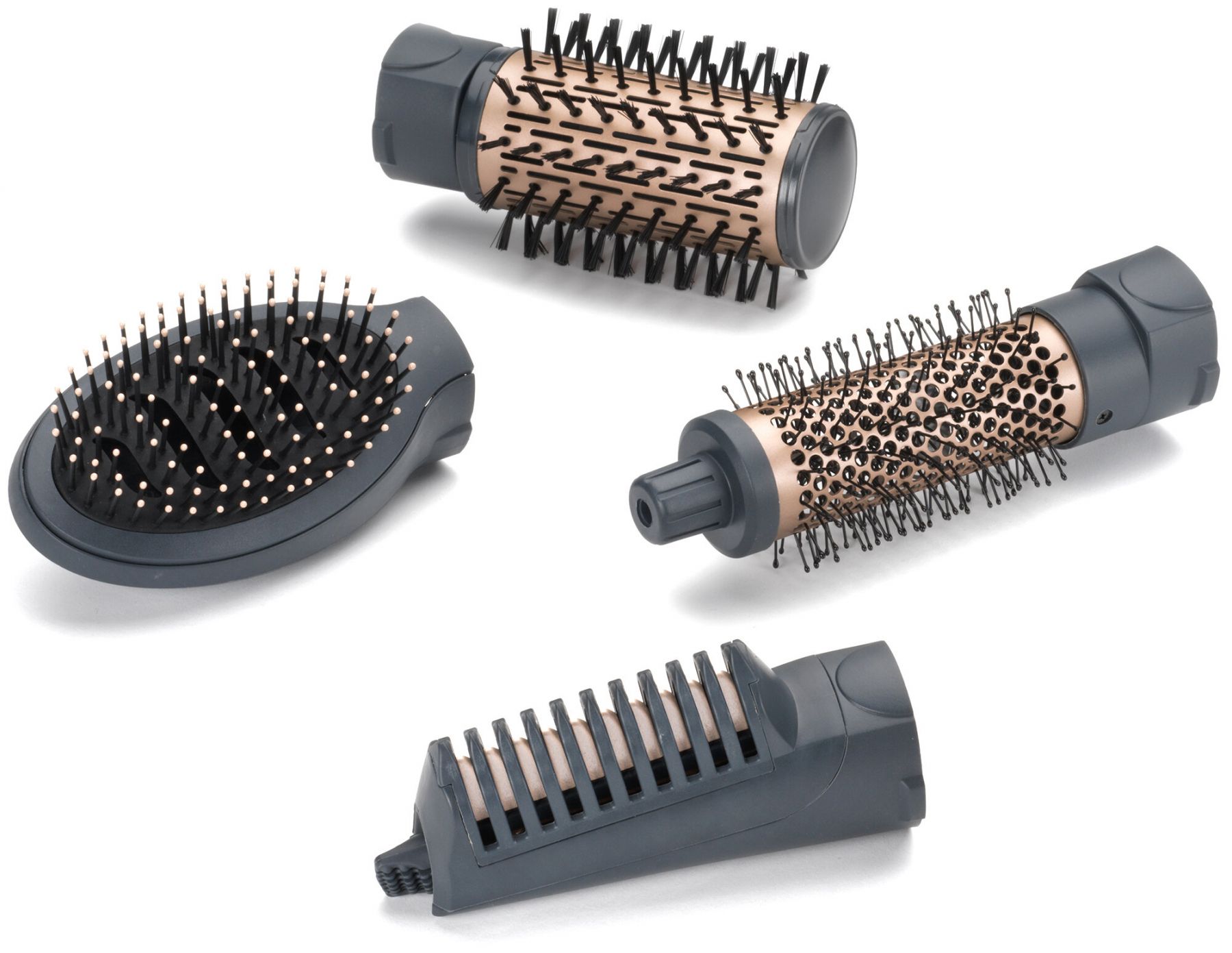 Насадки в комплекті:плоска щітка, насадка-гребінець з широкими зубцями, щітка з керамічним покриттям, щітка з м'якою щетиною