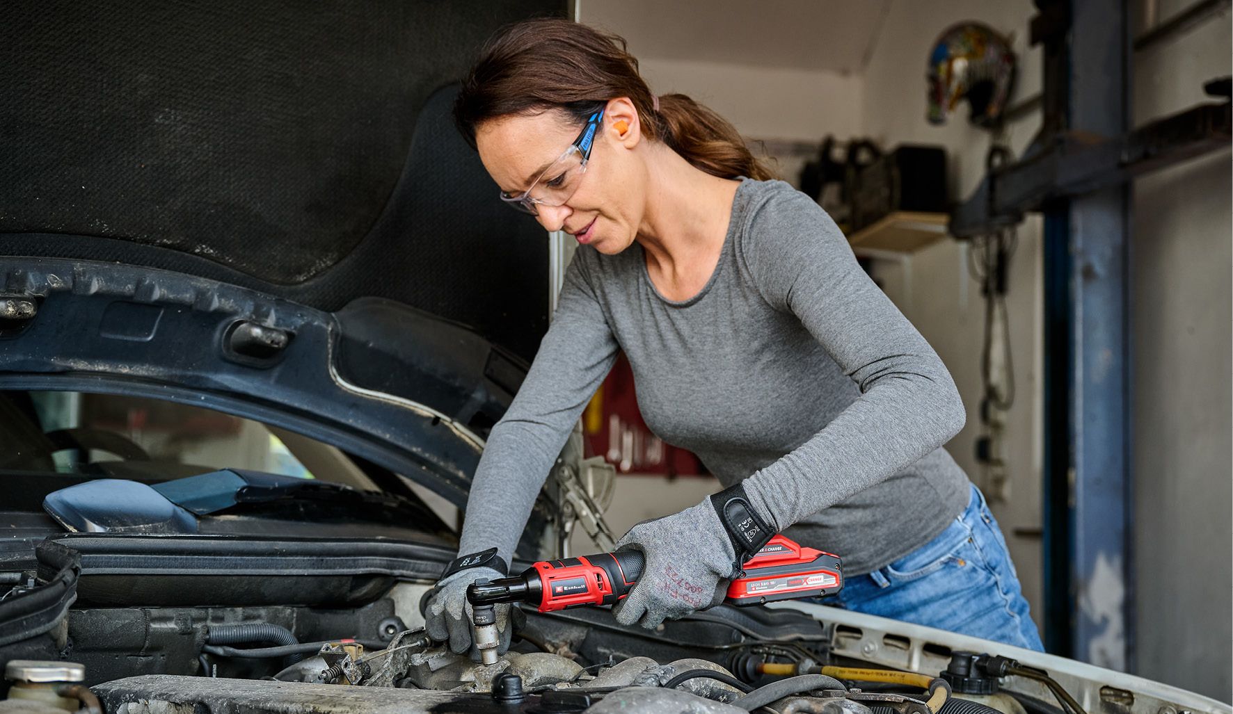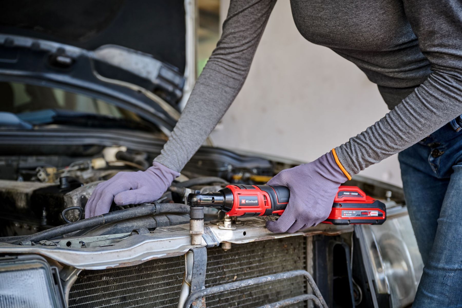 Акумуляторний гайковерт (тріскачковий ключ) Einhell TE-RW 18/60 Li - Solo - відмінне доповнення до будь-якої майстерні, що входить до сімейства Power X-Change. Інструмент має компактну конструкцію та підходить для роботи у вузьких місцях. Завдяки тримачеві для насадок 3/8" і крутному моменту 60 Нм, тріскачковий ключ може послаблювати і затягувати навіть сильно затягнуті гвинти.