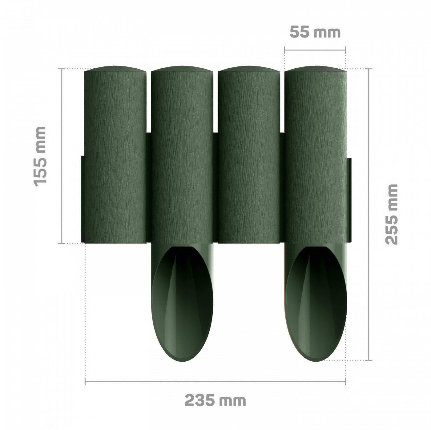 Ідеально відокремлює газон або стежку від городу або квіткових клумб. Конструкція нижньої частини попереджає її руйнування під час вбивання в землю. Текстура поверхні - "під дерево". Не вимагає технічного обслуговування. Стійка до ультрафіолетового випромінювання - стійкий колір, морозостійка. Зручний спосіб з'єднання елементів дозволяє формувати огорожу довільним чином. Кольори: коричневий, зелений, теракот, сірий. Довжина комплекту 2,3 метра.