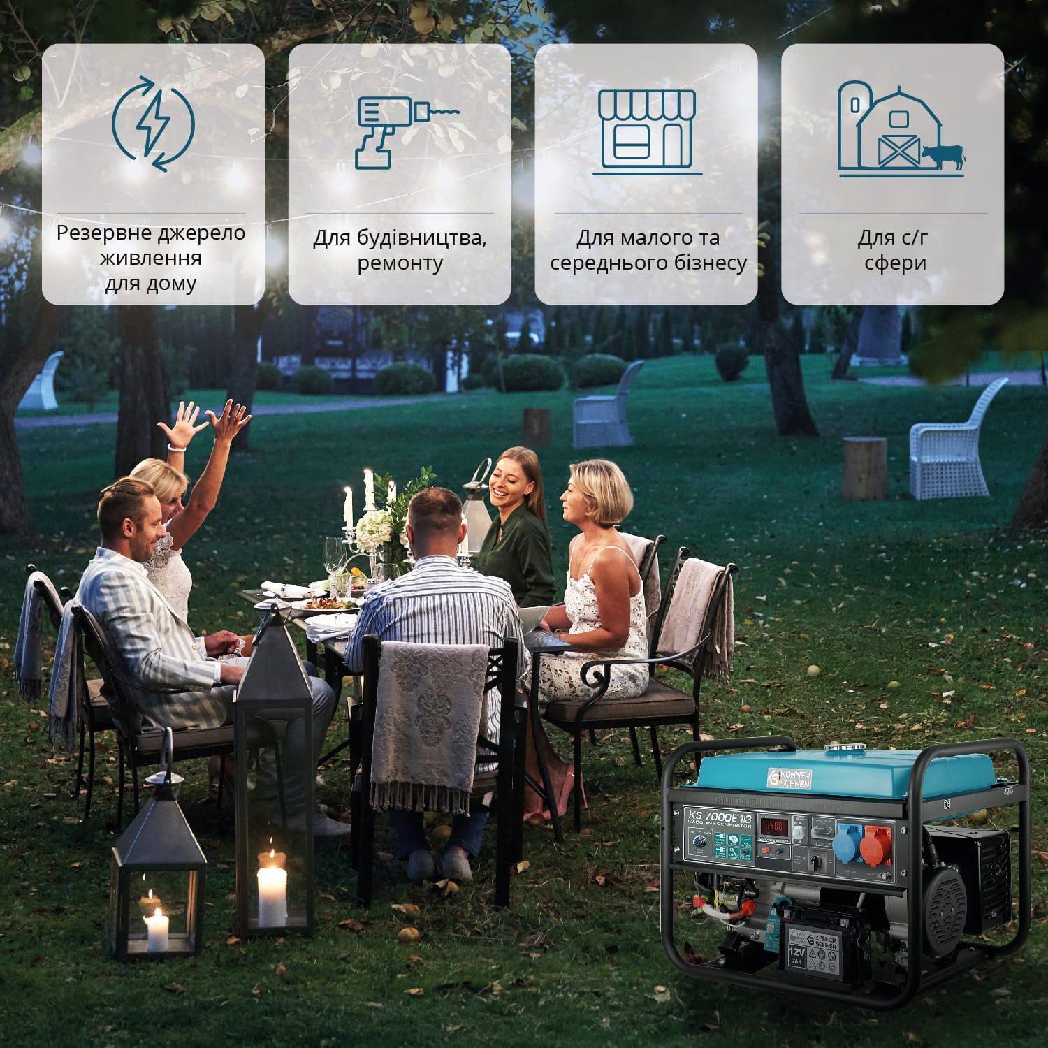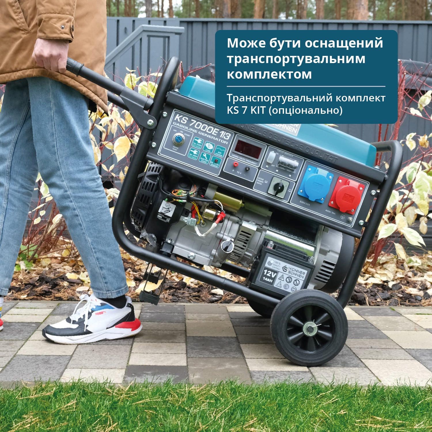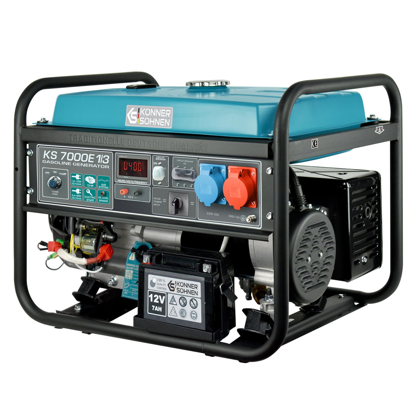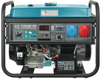 Бензиновий генератор Konner&Sohnen KS 7000E1/3 працює в однофазному та трифазному режимах з номінальною потужністю 5 кВт. Агрегат оснащений двигуном KS 390 з повітряним охолодженням і системою VTS для перемикання напруги. Електростартер і LED-дисплей полегшують запуск та моніторинг параметрів.