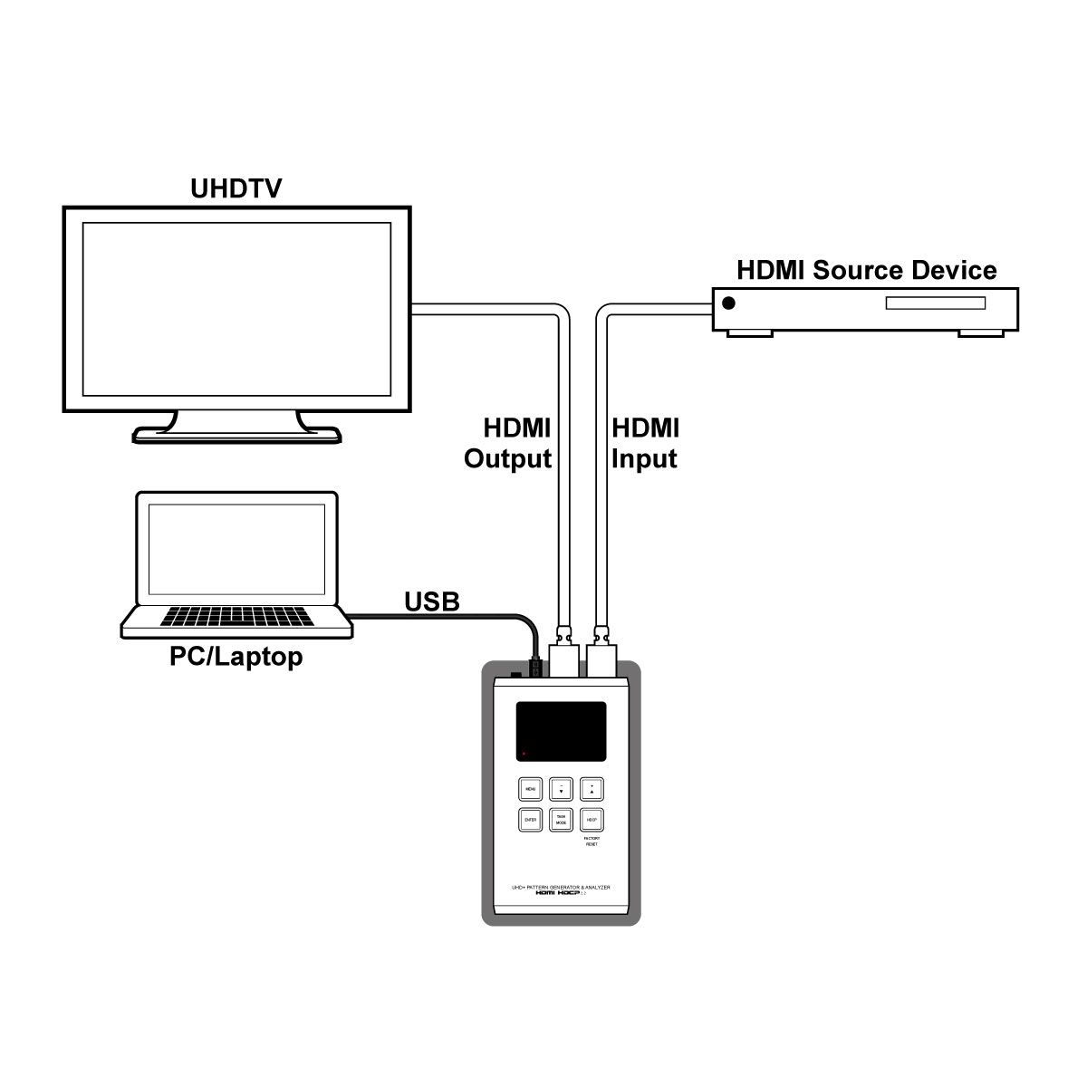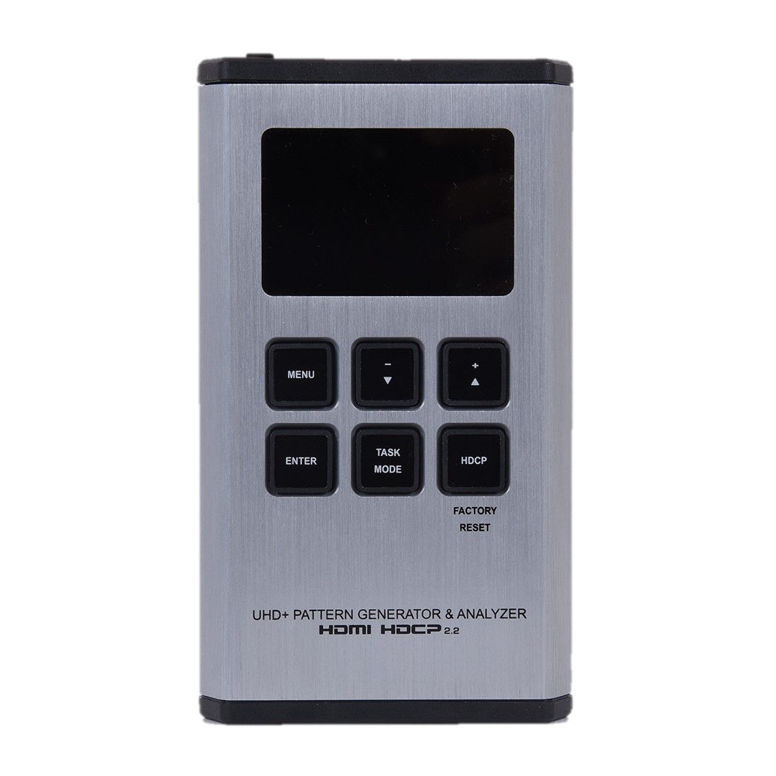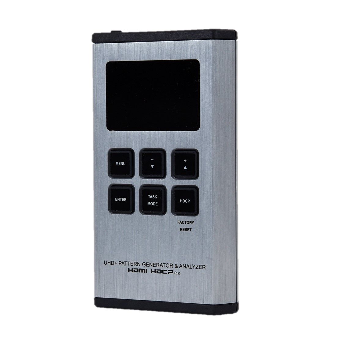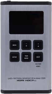 Генератор і аналізатор сигналів UHD+ HDMI (портативна версія). Режим аналізатора підтримує вихідне відео, аудіо, синхронізацію та аналіз пакетів, пропускаючи сигнал до підключеного дисплея. Джерела 4K можна масштабувати до 1080p у режимі аналізатора, щоб підтримувати більш широкий діапазон дисплеїв під час аналізу джерела з високою пропускною здатністю. Підтримка обходу, аналізу та генерації HDR відповідно до стандарту CEA, розширення статичних метаданих HDR CEA-861-F і CEA-861.3. Функції моніторингу HDCP і SCDC.