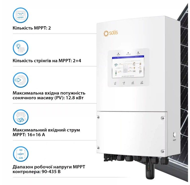 Гібридні Інвертор для зберігання енергії серії Solis S6 - PLUS - це універсальне рішення для домашніх фотоелектричних систем як для зберігання енергії так і для систем з "зеленим тарифом". Підтримуючи вхідний струм до 32 А MPPT і призначений для різних потужних фотоелектричних панелей, він пропонує 6-ступінчастий заряд і розряд з таймером, інтегроване управління батареями та функції захисту, які подовжують термін служби ваших батарей та забезпечують більшу ефективність енергетичної системи.