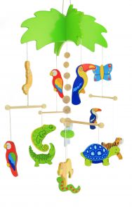 Дитячий дерев’яний мобіль німецького виробника іграшок goki – це необхідна розвиваюча іграшка для немовлят. Мобіль «Пальма» привертає увагу своєю яскравістю та цікавинками. Дванадцять кольорових тваринок та птахів сховалися під листями зеленої пальми. Дитяча іграшка почне кружлятись навіть від найменшого руху повітря. Деталі зроблені із натуральної деревини та вкриті водостійкими фарбами, що абсолютно безпечні для дитини. У майбутньому мобіль може стати прикрасою в дитячій кімнаті.