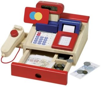 Дитячий ігровий набір представляє собою пристрій із натурального дерева у вигляді касового апарату. До набору входить прилад із вбудованим калькулятором, іграшковим механізмом друку чеків та сканером штрих-коду. Також набір має скриньку з іграшковими картками та грошима. Такий касовий апарат допоможе дитині розвинути математичне та аналітичне мислення, послідовність дій та цілеспрямованість.