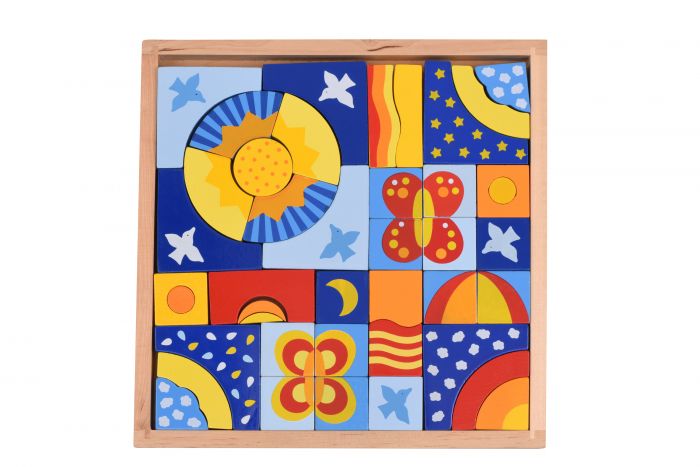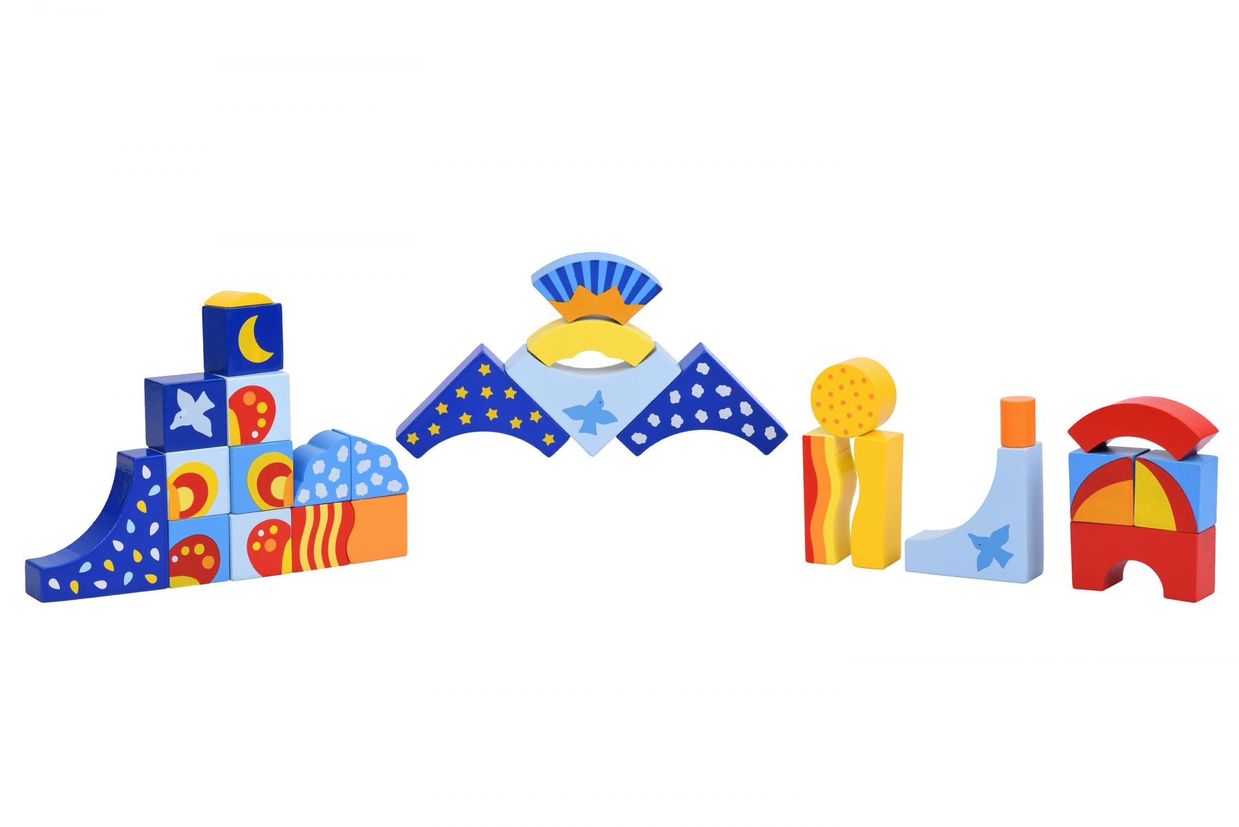 Дерев'яний конструктор складається з 41 деталі з різними малюнками і візерунками. З ним можна грати як з пазлами та збирати малюнки, які задумали дизайнери, а також використовувати як доповнення до інших дерев'яним іграшок. Грати буде цікаво не тільки дітям, а й дорослим. Гра цим набором навчить дитину гармонії і логічного мислення. Вікове обмеження - від трьох років, а використовувана деревина - екологічно чиста. Розмір упаковки: 23.3 x 23.3 x 2.3 см
