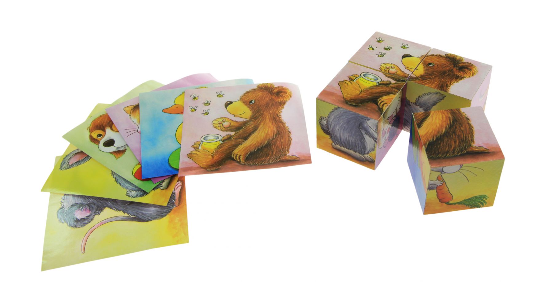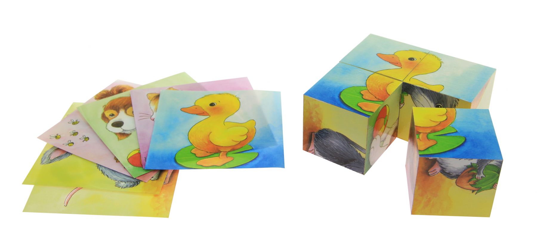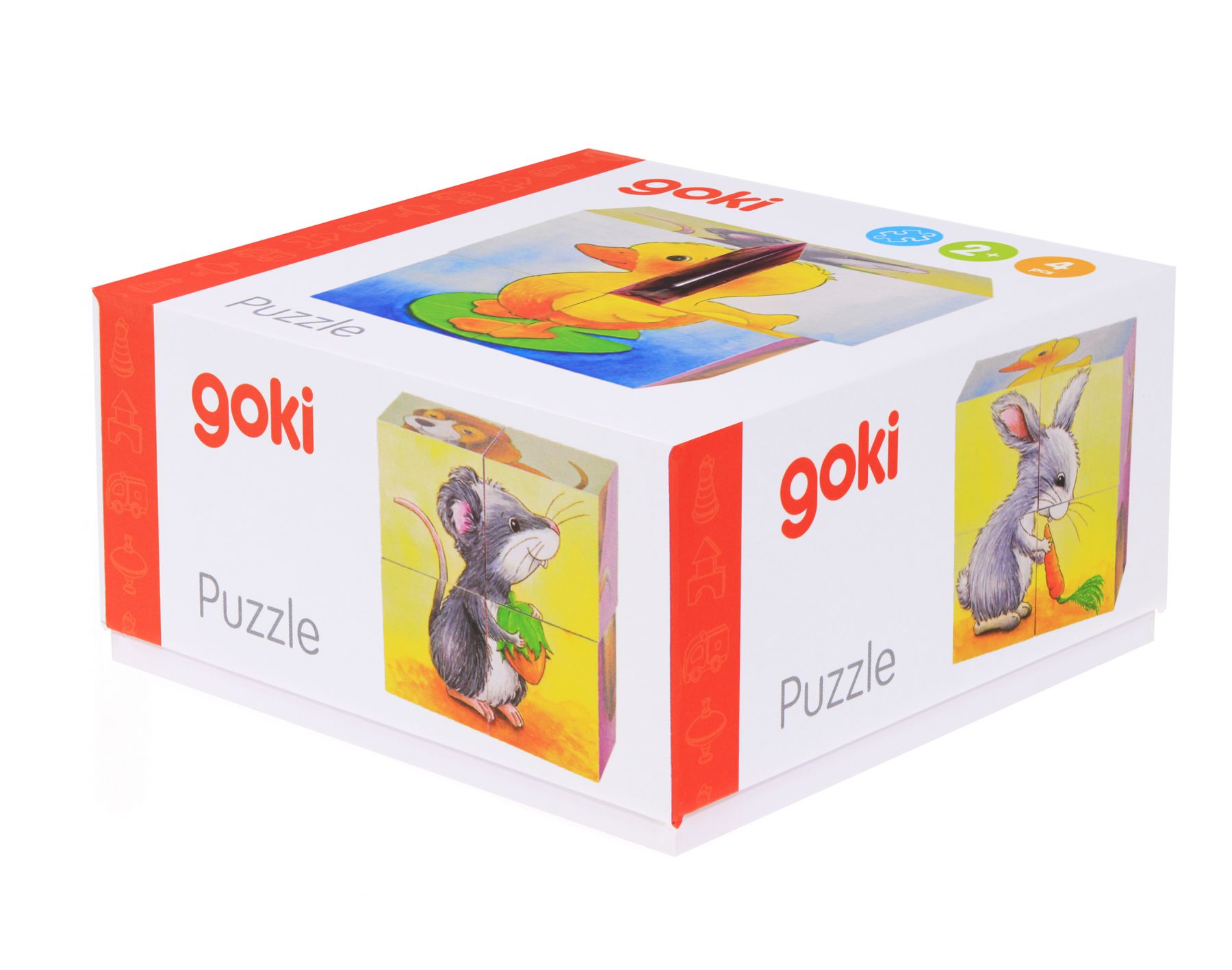 Дерев’яні кубики німецького виробника іграшок goki – це гра для найменших діток. 4 кубики дозволяють скласти 6 різних сюжетів. Зображення тваринок яскраві та зрозумілі, тому дитина зможе самостійно складати картинку. Кубики виконані з натурального дерева без використання токсичних матеріалів. Складання кубиків із звірятками розвиває візуальне сприйняття, образне мислення та моторику рук.