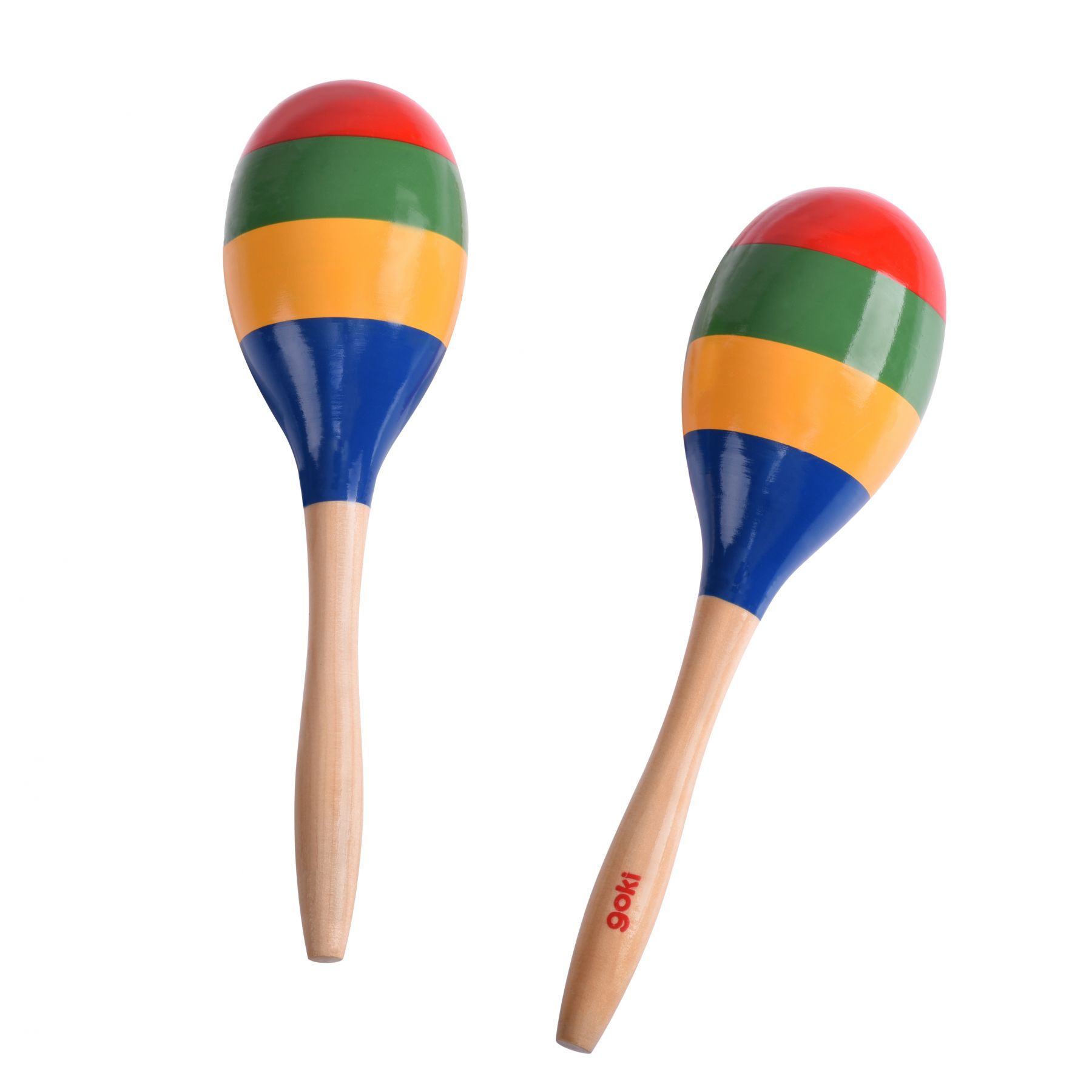 Музичний інструмент маракас німецького виробника іграшок goki – виготовлений із безпечного матеріалу – натуральної деревини. Деревина покрита натуральними фарбами на водній основі. У комплекті два однакові вироби; маракаси завдовжки 23 см.