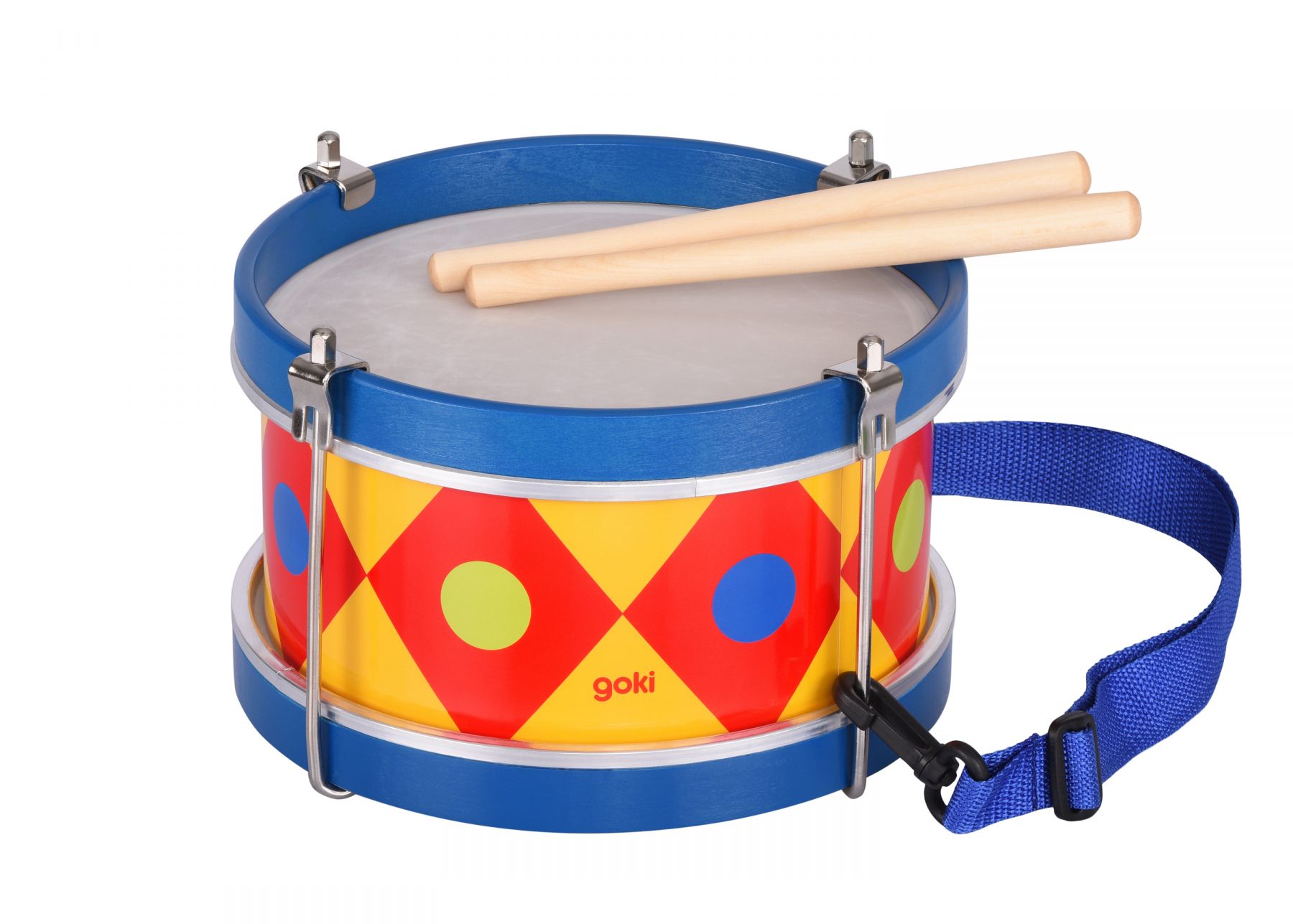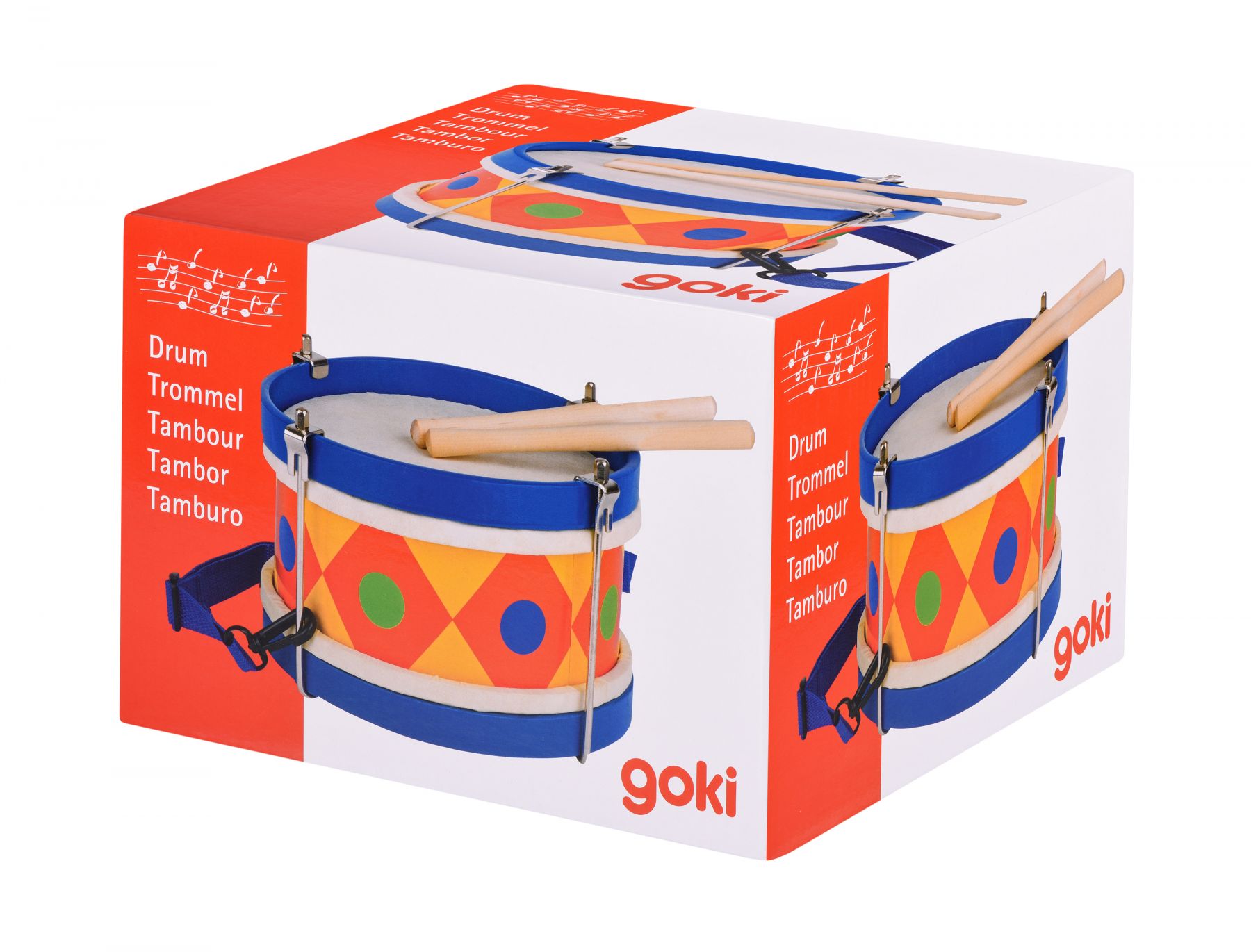 Яскравий барабан німецького виробника goki. Стильний дизайн, якісна надійна конструкція виробу, чудове звучання; такими особливостями вирізняється музичний інструмент. Каркас барабана дерев’яний, а мембрани – шкіряні. Міцна, надійна конструкція витримає сильні удари. В комплекті є дві дерев’яні палички, завдовжки 20 см, а також металевий ключ для налаштування інструмента. Барабан заввишки 13,5 см. Діаметр мембрани – 22 см. Інструмент призначений для дітей від трьох років. Поставляється у фірмовій картонній коробці.
