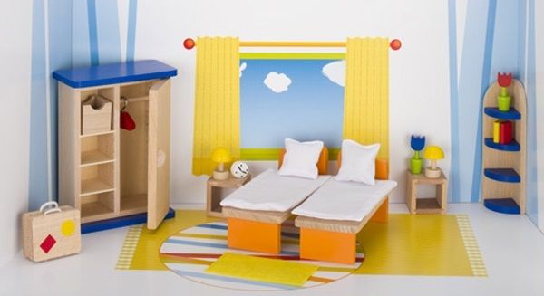 Німецький виробник іграшок goki пропонує дітям чудове доповнення до їх лялькових будиночків - набір меблів для спальні. У комплект входить: шафа, велике ліжечко, тумбочки, вішалка, лампи та текстильні елементи – подушки і матрацики. Набір урізноманітнить гру із ляльками, яка так корисна для дівчат віком від 3-х років. Деталі вироблені із натурального дерева, вкритого безпечними фарбами на водній основі.