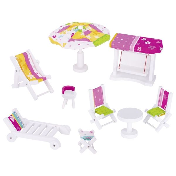 Влаштуйте улюбленим лялькам літній відпочинок разом з набором «Садові меблі» від німецького бренду goki. Набір із колекції Susibelle відрізняється яскравим дівочим дизайном – білі меблі із рожево-блакитним декором з квіточками дарують відчуття легкості та весняного настрою. Тут безліч предметів: стільці для відпочинку, шезлонг, гойдалка, столик і велика садова парасолька. Набір можна використовувати окремо, або із будь-якими ляльковими будиночками із ляльками goki. Усі елементи вироблені із натурального дерева і текстилю. Для дітлахів від 3-х років.