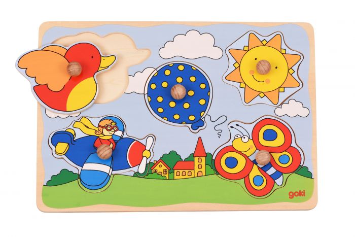 Дерев’яний пазл німецького виробника goki – захоплива, розвивальна іграшка. Пазл-вкладиш, складається з дошки основи і 5 вкладишів, які доповнюють зображення. Виріб виготовлений із натуральної деревини. Малюнок нанесений нетоксичними, безпечними фарбами. Розмір пазла – 30х21 см. Іграшка призначена для дітей від одного року.