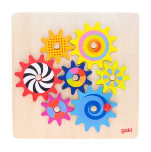 Дитяча розвиваюча гра «Пізнавальні шестерінки» німецького виробника іграшок goki виконана із натурального дерева та кольорових фарб на водній основі. Суть гри полягає в тому, щоб розмістити яскраві шестерінки на площині в певному місці так, щоб запустився механізм їх взаємодії. Правильно розміщені елементи рухаються, переливаючись різними кольорами. Ця іграшка розвиває творчі здібності дитини, моторику рук, логічне мислення та сприйняття кольору. Всі матеріали нетоксичні і безпечні для дитини.
