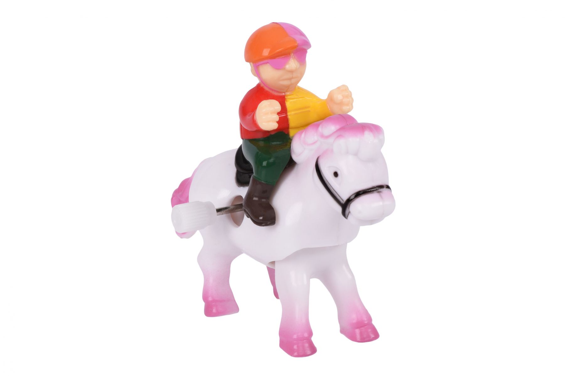 Заводна іграшка «Мексиканець» від німецького бренду goki допоможе у правильному та повноцінному розвитку малюка. Заводна іграшка з фігуркою мексиканця на коні кумедно рухається і видає звуки цокоту копит. Достатньо декілька разів провернути заводний механізм – і наїзник на конячці стрімко і весело поскочить вперед. Іграшка розвиватиме моторику рук, зорове і слухове сприйняття, а також неодмінно покращить настрій.