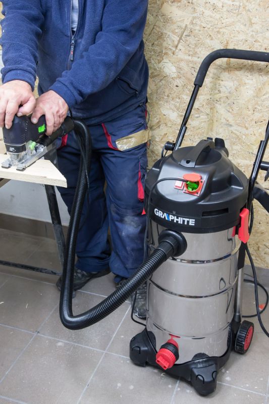 Професійний промисловий пилосос GRAPHITE призначений для швидкого та ефективного прибирання сміття після виконання робіт в майстерні. Пилосос служить як для вологого, так і для сухого прибирання. Завдяки великій силі всмоктування, пилосос може використовуватися для прибирання різного сміття. Пилосос з функцією повітродувки. Крім того, пилосос оснащений поплавковим клапаном безпеки для вологого прибирання і зливною пробкою для зливу брудної води. Великі задні колеса і запобігання кронштейнами передні колеса забезпечують безпечне переміщення в важких робочих умовах. Існує можливість підключення електроінструменту до розетки пилососа. Трипозиційна кнопка включення забезпечує пуск пилососа при включенні електроінструменту, або пуск тільки пилососа без електроінструменту.