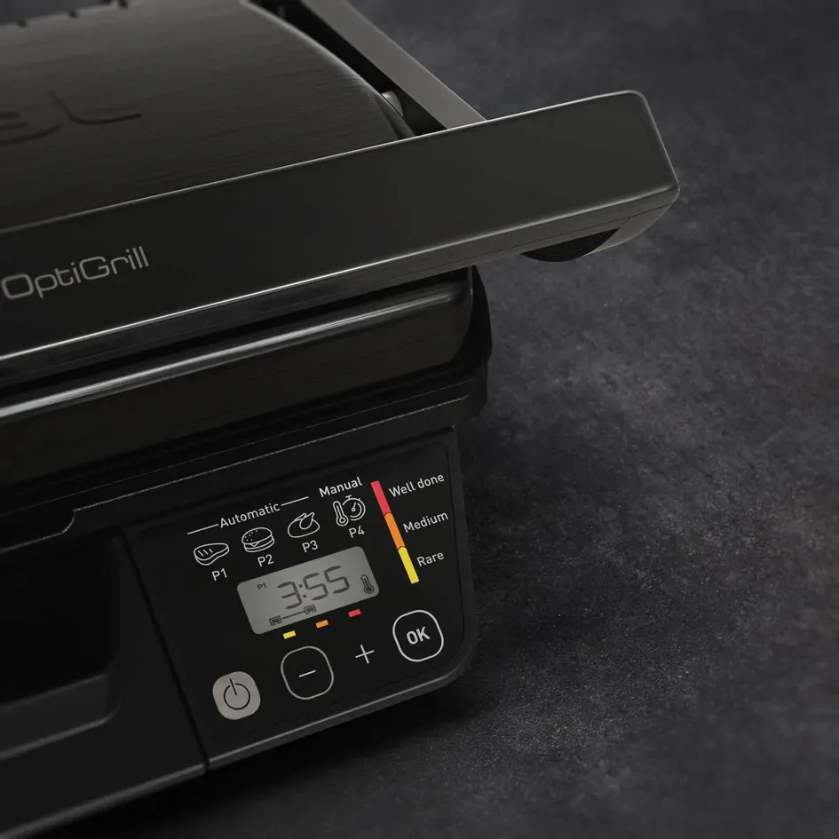 Tefal OptiGrill GC7P0810 — прижимний електрогриль 2000 Вт із нержавіючим корпусом та знімними антипригарними пластинами розміром 30х20 см. Автоматично визначає товщину й кількість шматків і підбирає час приготування для точного результату від rare до well-done. Є цифровий екран зі зворотним відліком, 3 автоматичні програми та ручне регулювання температури 120–270 °C. Знімні антипригарні пластини й піддон для жиру придатні для миття в посудомийній машині.