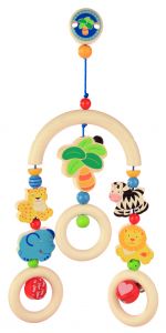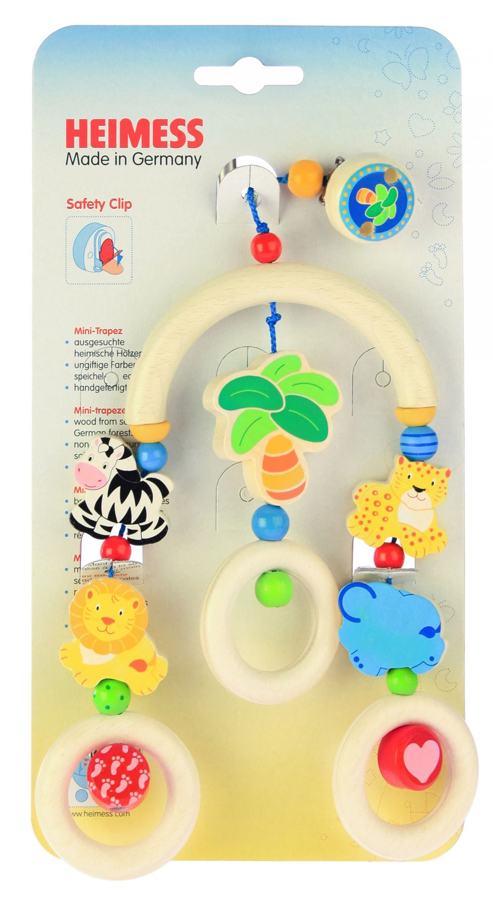 Класична дерев’яна іграшка «Африка» він німецького бренду Heimess для малюків. Мобайл має кліпсу для розміщення його над дитячим ліжечком або візочком. Його можна не тільки розглядати, а й хапати, гризти, тягнути тощо. Завдяки мобайлу дитина познайомиться з левом, зеброю, леопардом та слоником, що колихаються під африканською пальмою. Мобайл прикрашений маленьким металевим дзвіночком для тренування слуху. Частини мобайлу зроблені з натурального дерева, яке просочують кольоровими фарбами на водній основі. Металеві частини не викликають алергії, а фарба нетоксична і тримається дуже міцно.