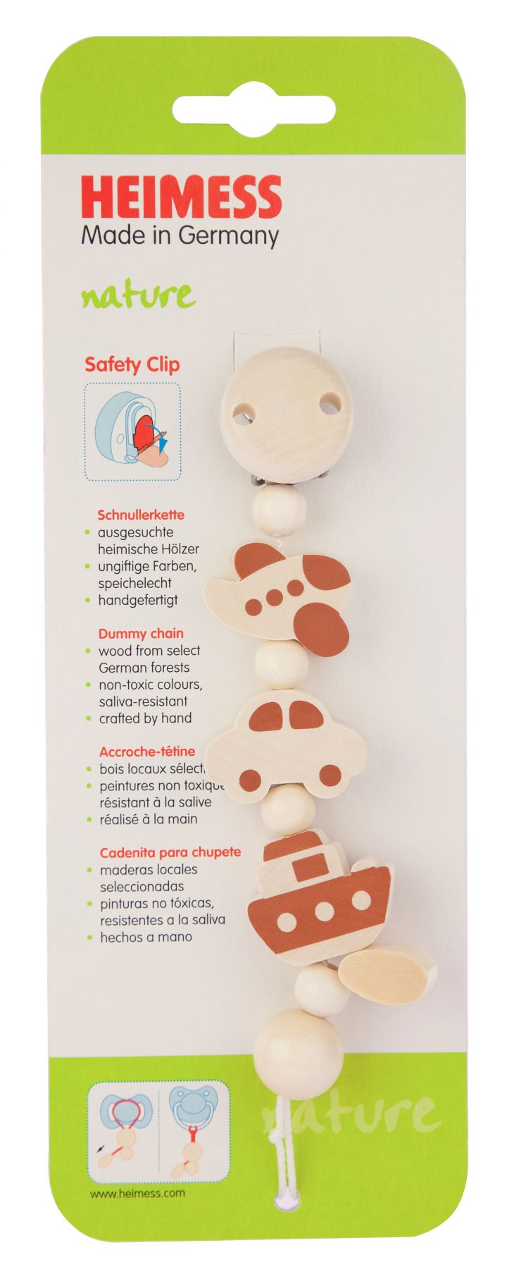 Розвиваюча кліпса для пустушки «Мандрівка» від німецького бренду Heimess вироблена виключно із натуральної деревини молочного кольору. З одного кінця кліпса чіпляється за одяг, а з іншого – петля вдягається на пустушку. Розмір петлі може регулюватись. Природні дерев’яні елементи у формі кульок, літака, машинки та корабля будуть приваблювати дитину. Ви можете не хвилюватись за безпеку дитини, оскільки деталі оброблені дуже якісно. Кліпса для пустушки «Мандрівка» має і велику розвиваючу функцію. Завдяки такому аксесуару, дитина буде розвивати: зір, моторику рук, відчуття розмірів та матеріалів.