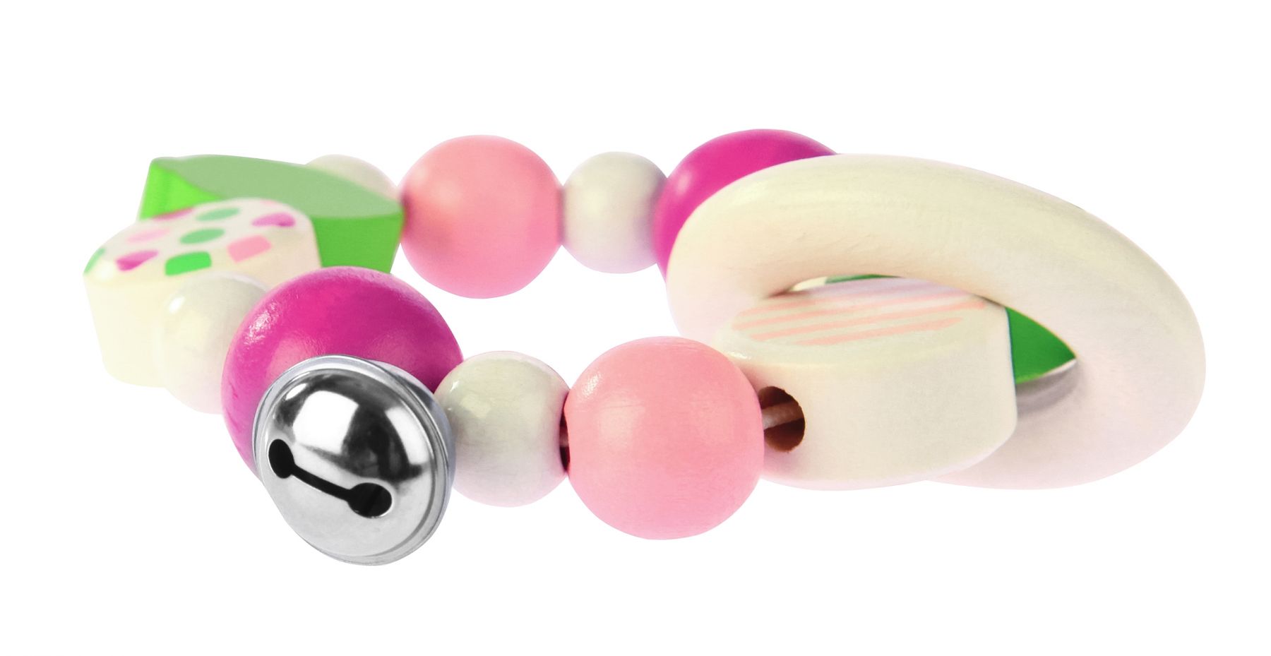 Яскраве дерев’яне брязкальце «Слоненятко» від німецького бренду Heimess для немовлят. Його різноманітні деталі привертають увагу дітей: плоскі зелені елементи, круги з візерунками, білі та рожеві кульки – всі вони поєднуються міцним шнуром. Брязкальце-браслет прикрашає металевий дзвіночок. Іграшка виконана із сертифікованих матеріалів: натурального дерева, яке просочують нетоксичними фарбами на водній основі. Розвиваюче брязкальце допоможе дитині розвити моторику, зір, слух, сприйняття кольору та причинно-наслідкові зв’язки.