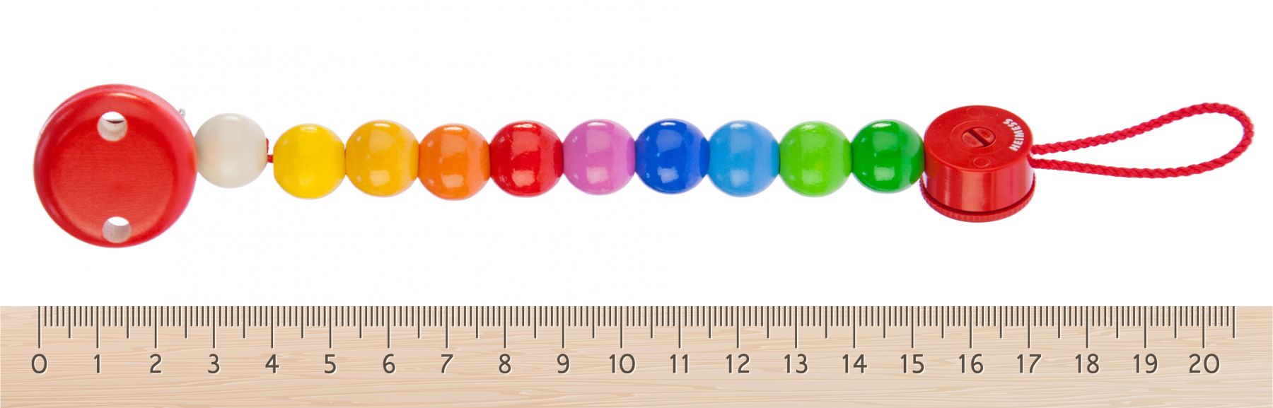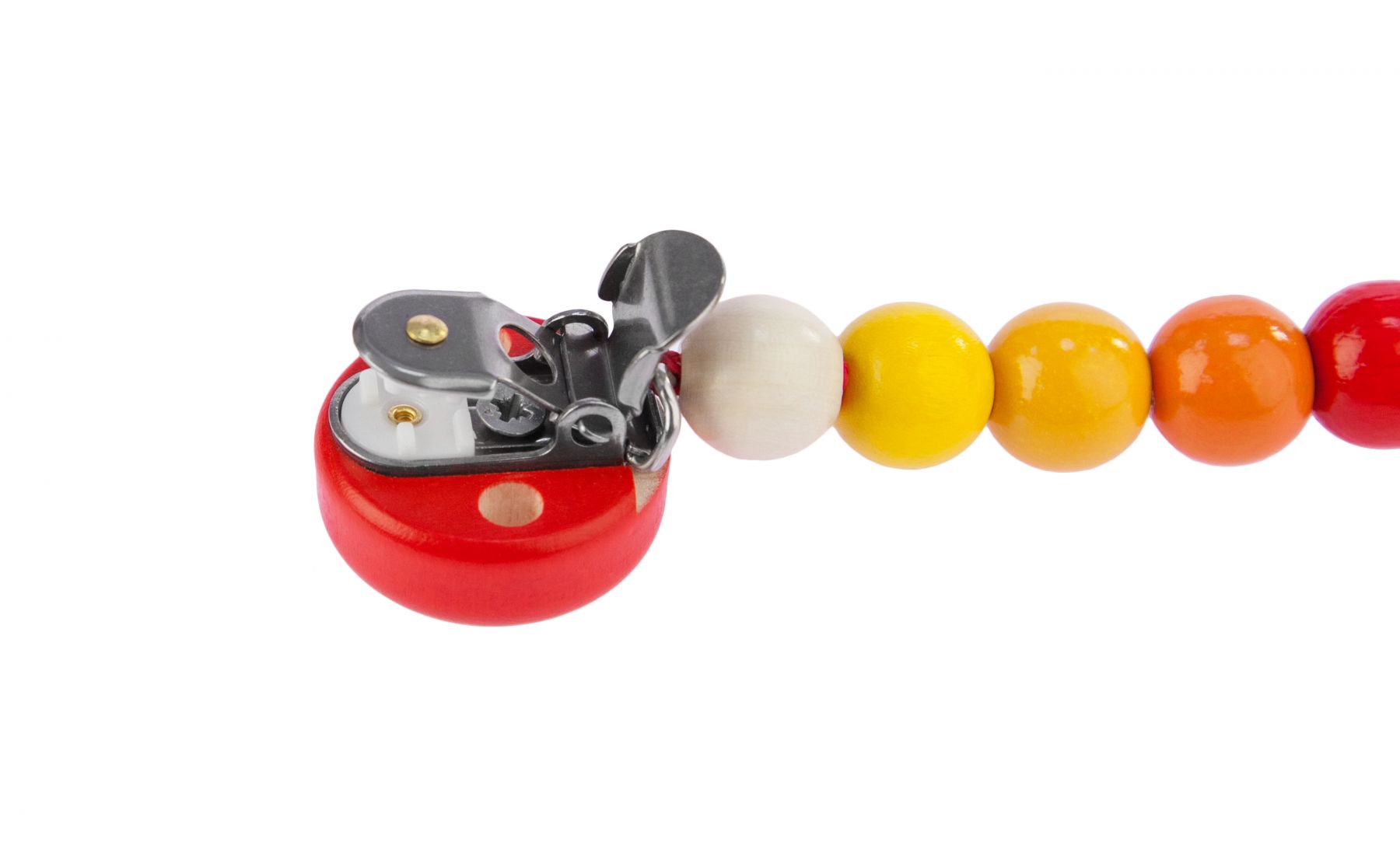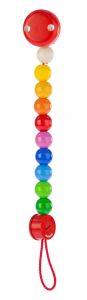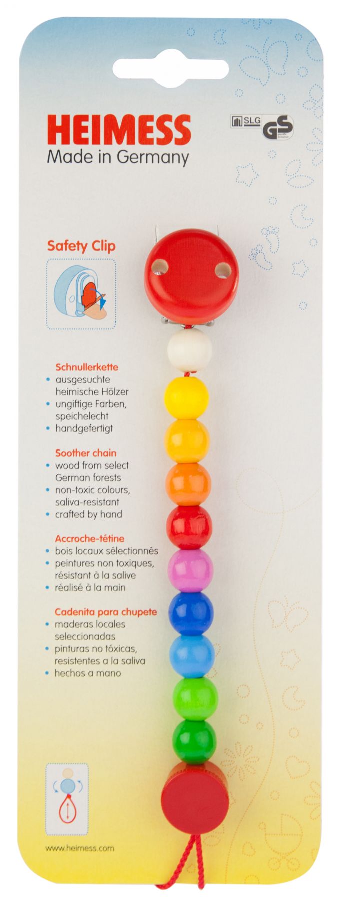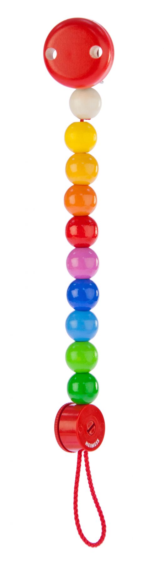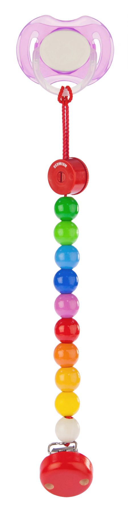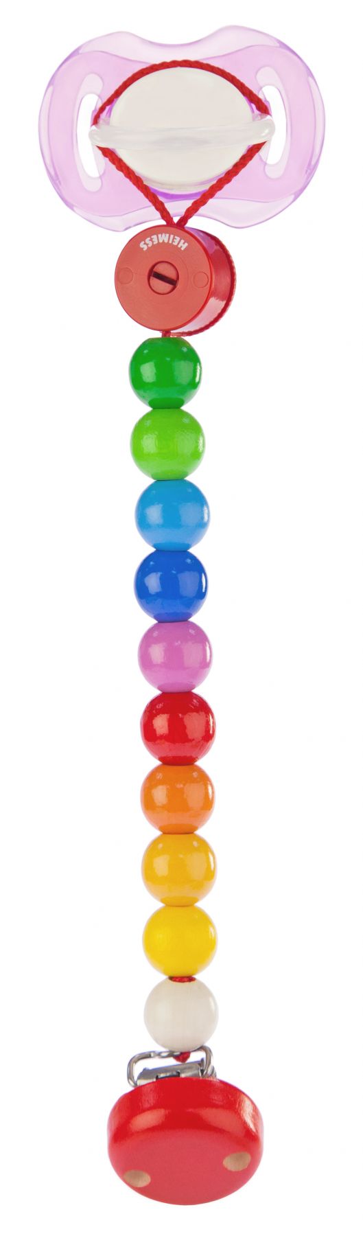 Кліпса для пустушки «Райдуга» із натурального дерева від німецького бренду Heimess. Тепер пустушка ніколи не загубиться і завжди буде чистою, завдяки спеціальній кліпсі з одного кінця, що кріпиться на одяг. З іншого – спеціальна петля, що вдягається на пустушку і регулюється. Кліпса – важливий розвиваючий аксесуар – завдяки їй у дитини будуть розвиватись зорові і тактильні навички, дрібна моторика, координація рухів. Кліпса має вигляд ланцюжка із привабливими кульками у кольорах райдуги. Елементи зроблені з натуральної та якісно обробленої деревини, що просочується безпечними фарбами на водній основі.