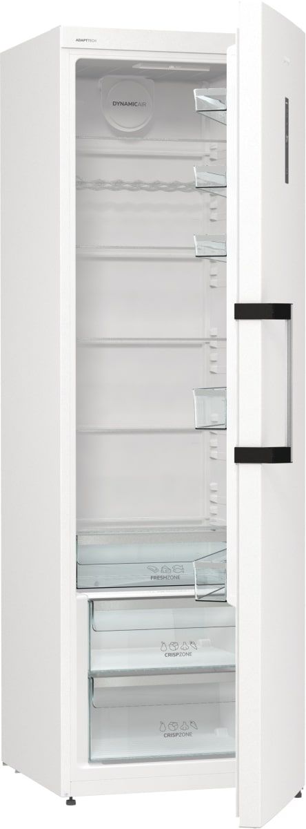 Холодильна камера Gorenje створена для зберігання продуктів у просторому внутрішньому об’ємі з продуманою організацією полиць і зон. Система AdaptTech стабілізує температуру під час частого відкривання дверцят, зменшуючи коливання всередині камери. Рівномірне охолодження забезпечується вентиляцією DynamicAir, а контейнер CrispZone з SmartHumidity автоматично контролює вологість для овочів і фруктів. Для м’яса, риби та сирів передбачено окрему шухляду FreshZone зі зниженою температурою.