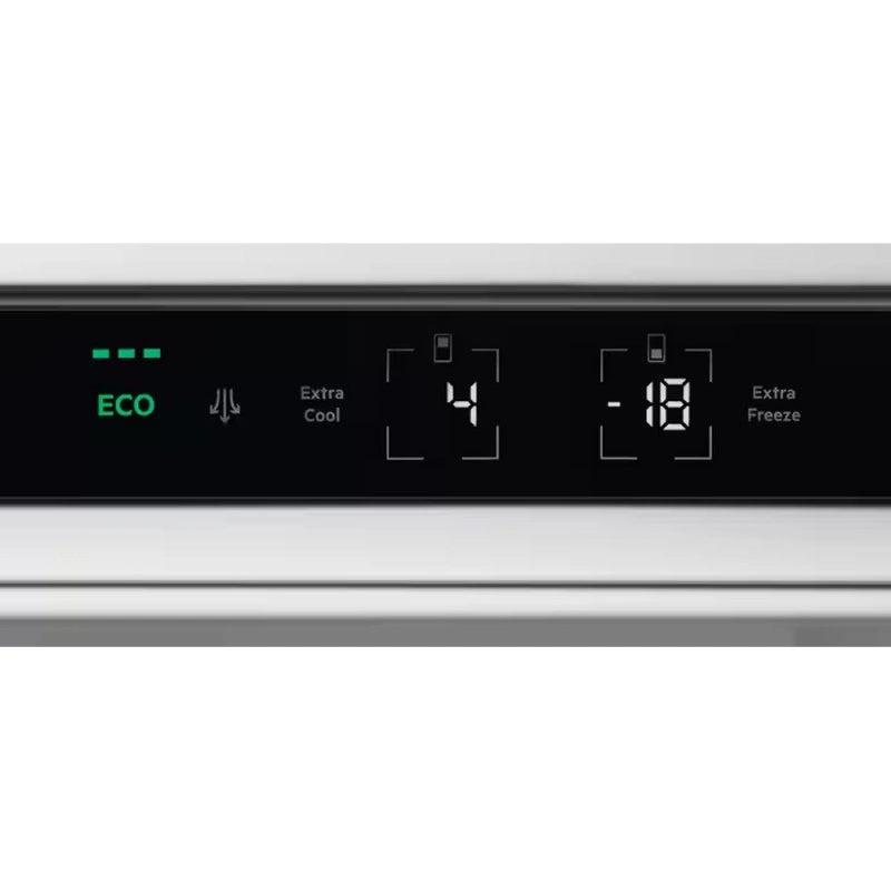 Вбудований холодильник Electrolux LNG7TE18S з нижньою морозильною камерою оснащений розсувним кріпленням фасаду для повної інтеграції. Корисний об'єм становить 253 л (192 л холодильна камера та 61 л морозильна). Технологія TwinTech No Frost забезпечує роздільне охолодження камер без утворення інею в морозильнику. Ящик GreenZone зберігає вітаміни в овочах та фруктах завдяки контролю вологості. Інверторний компресор характеризується тихою роботою, функції Action Cool та Action Freeze підтримують швидке охолодження та заморожування.