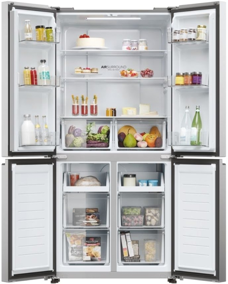 Нова модель холодильника Haier HCR3818ENMM відкрила світу можливість існування 4-дверного потужного пристрою, здатного охолоджувати продукти тихо і якісно. Багатофункціональність та вишуканість поєдналися, щоб ви користувалися якісним приладом, який стане ще й прекрасним дизайнерським рішенням для вашої кухні. 467 літрів — саме стільки продуктів може вмістити цей здоровань, забезпечивши преміумохолодження як у вашій оселі, так і в кафе та ресторані.