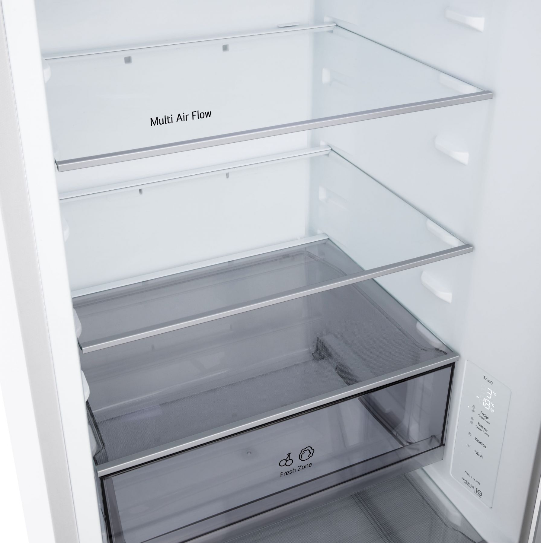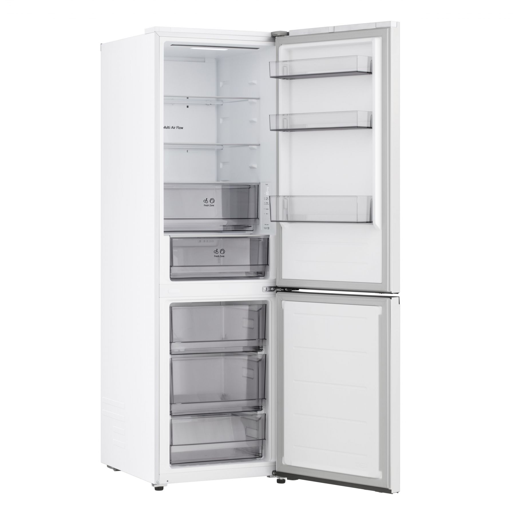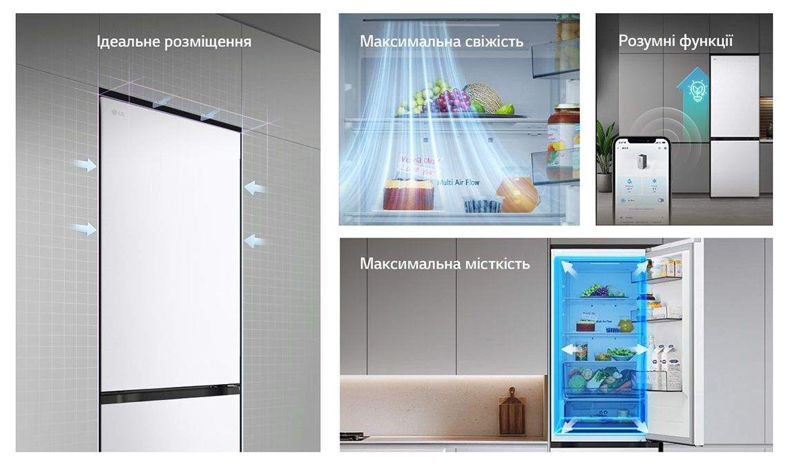 Функції / можливості:Експрес заморозка, LED освітлення, Експрес охолодження, Багатопотокова система охолодження Multi Air Flow, Антибактеріальний ущільнювач Bio Shield, DoorCooling+, Зона свіжості Fresh Zone, Сигнал відкритих дверцят, Технологія контролю напруги, LG ThinQ з керуванням через Wi-Fi, Інтелектуальна система діагностики Smart Diagnosis, Багатопотокова система охолодження морозильного відділення