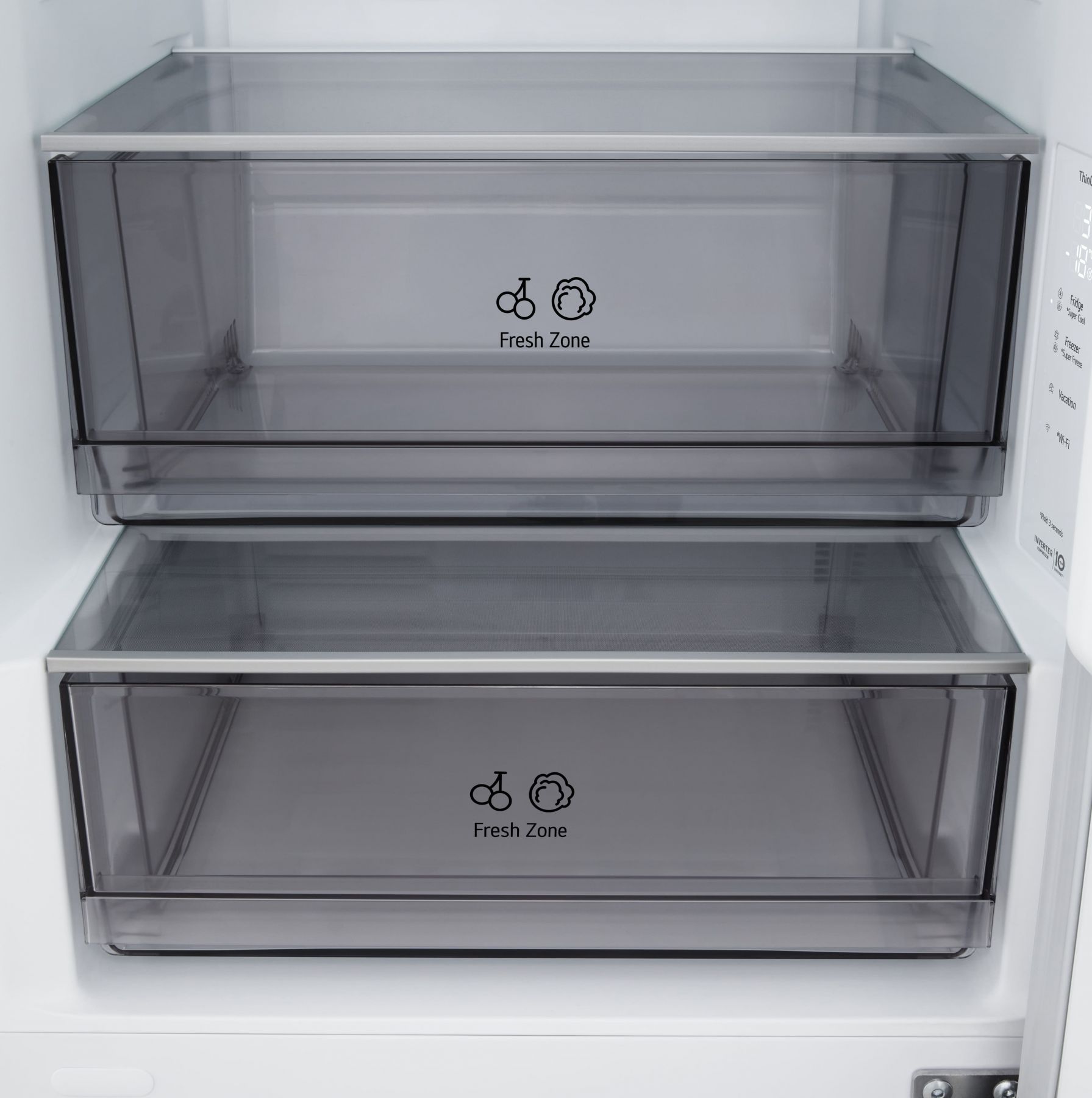 Холодильник LG GC-B459EQYM з нижньою морозильною камерою підтримує стабільну температуру завдяки інверторному компресору та системі Total No Frost. Загальний корисний об’єм — 333 літри: 220 літрів у холодильній камері та 113 літрів у морозильній. Технологія DoorCooling+ швидко відновлює холод після відкриття дверей, а зона свіжості Fresh Zone зберігає овочі та фрукти довше.