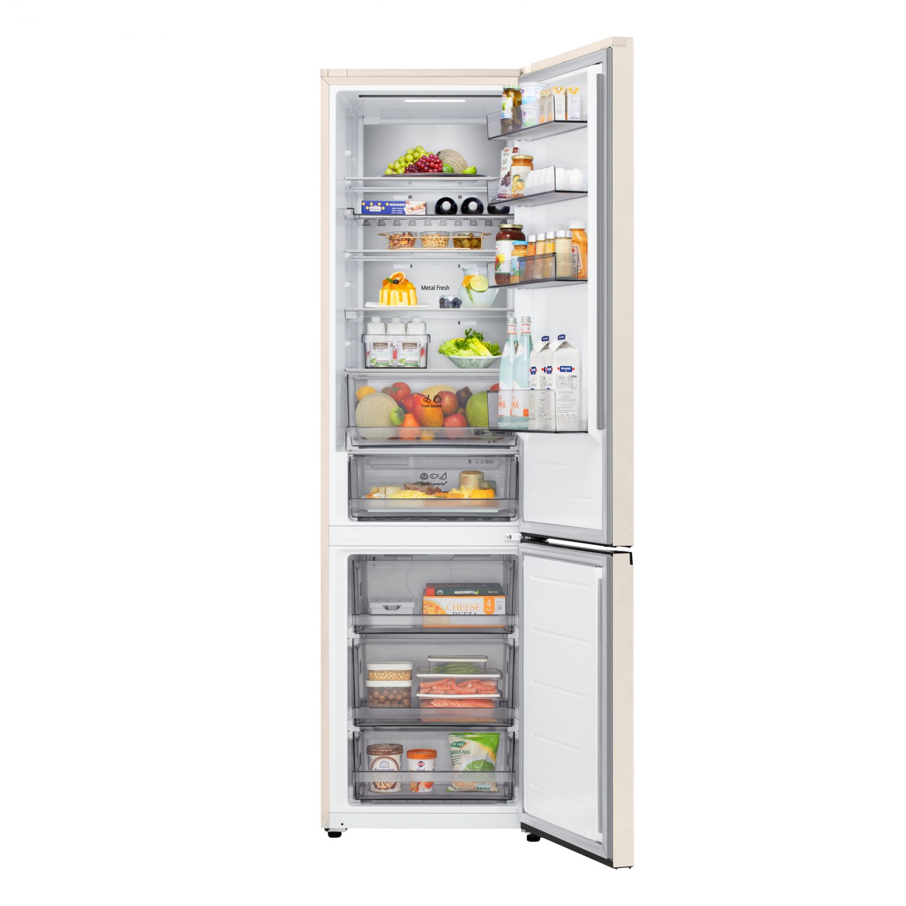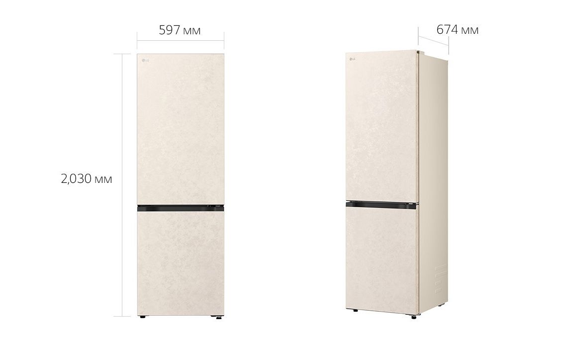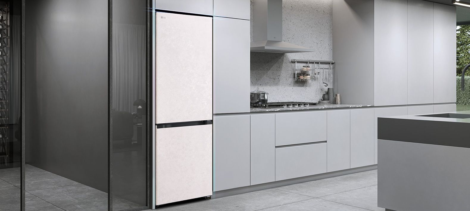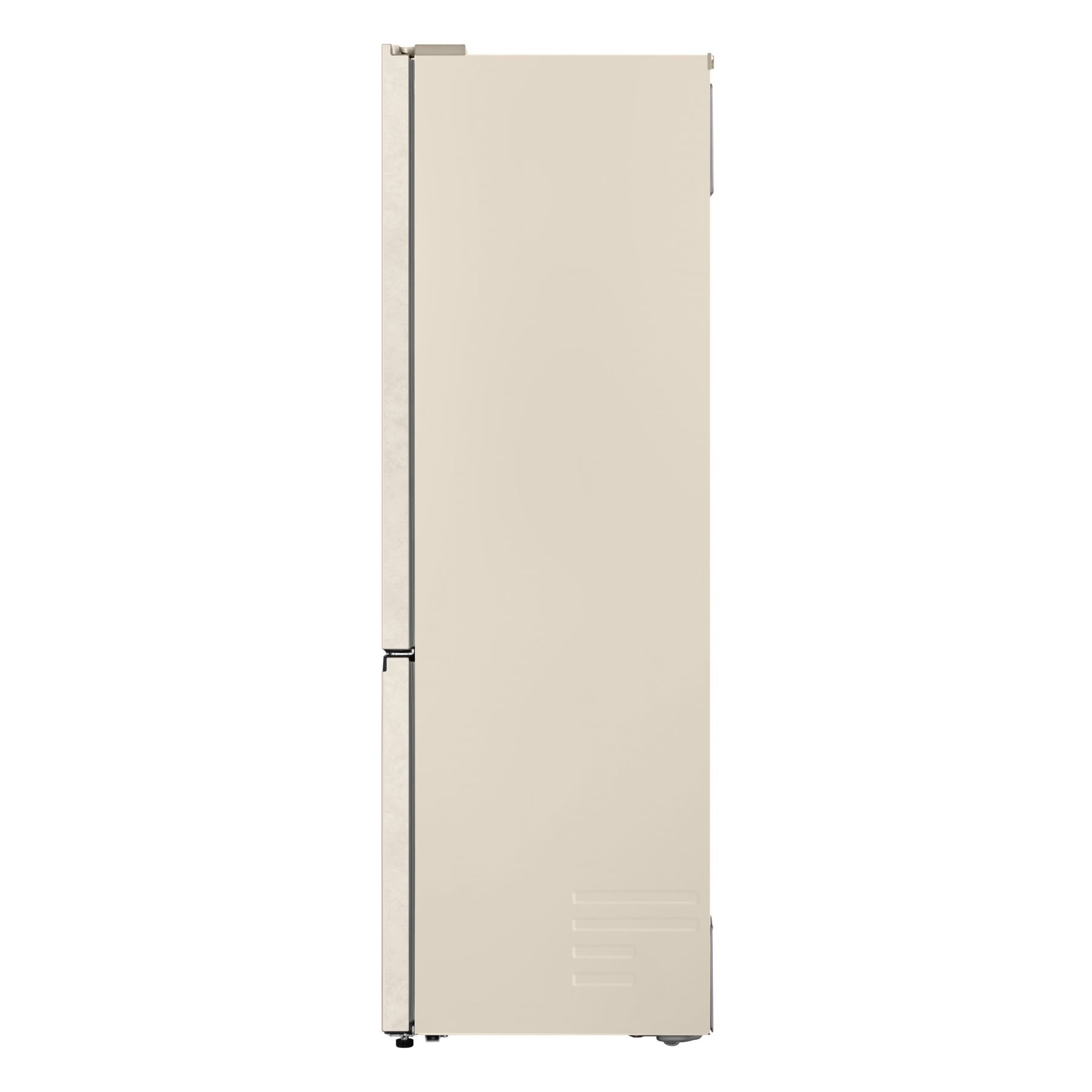Холодильник LG GC-B509EESM з нижньою морозильною камерою має корисний об’єм 375 л (262 л холодильне + 113 л морозильне відділення) і належить до енергетичного класу E. Інверторний компресор забезпечує тиху роботу на рівні 35 дБ та потужність заморожування до 10 кг на добу. Система Total No Frost усуває потребу в розморожуванні, а Metal Fresh разом із зонами Fresh Converter та Fresh Balancer дозволяють підтримувати оптимальні умови для різних типів продуктів. Бежевий матовий колір корпусу та прихована горизонтальна ручка створюють м’який, нейтральний вигляд.