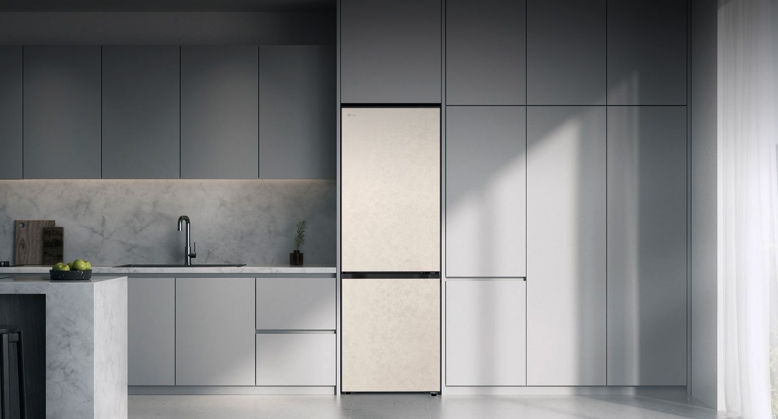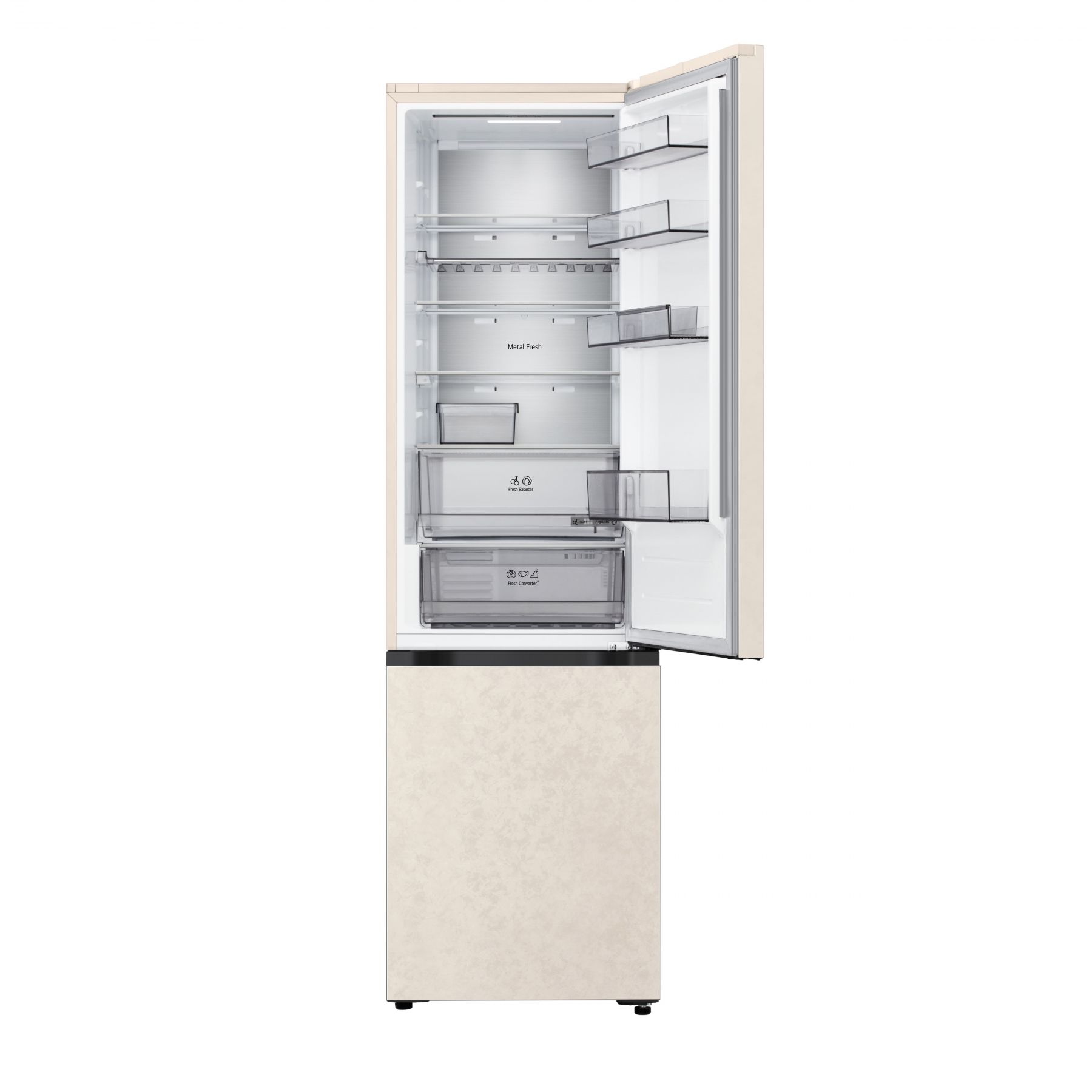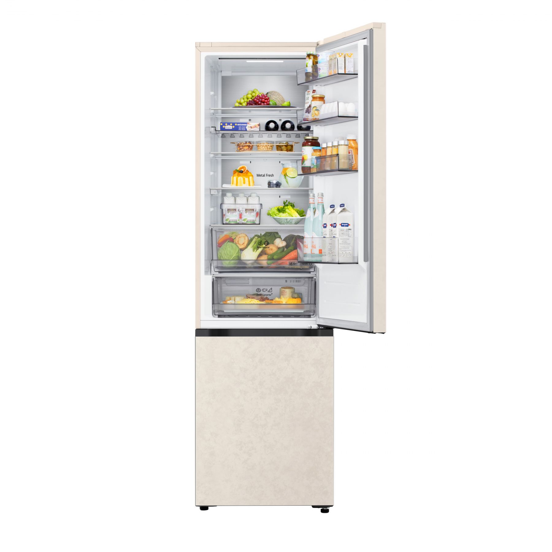Холодильник LG GC-B509EESM з нижньою морозильною камерою має корисний об’єм 375 л (262 л холодильне + 113 л морозильне відділення) і належить до енергетичного класу E. Інверторний компресор забезпечує тиху роботу на рівні 35 дБ та потужність заморожування до 10 кг на добу. Система Total No Frost усуває потребу в розморожуванні, а Metal Fresh разом із зонами Fresh Converter та Fresh Balancer дозволяють підтримувати оптимальні умови для різних типів продуктів. Бежевий матовий колір корпусу та прихована горизонтальна ручка створюють м’який, нейтральний вигляд.