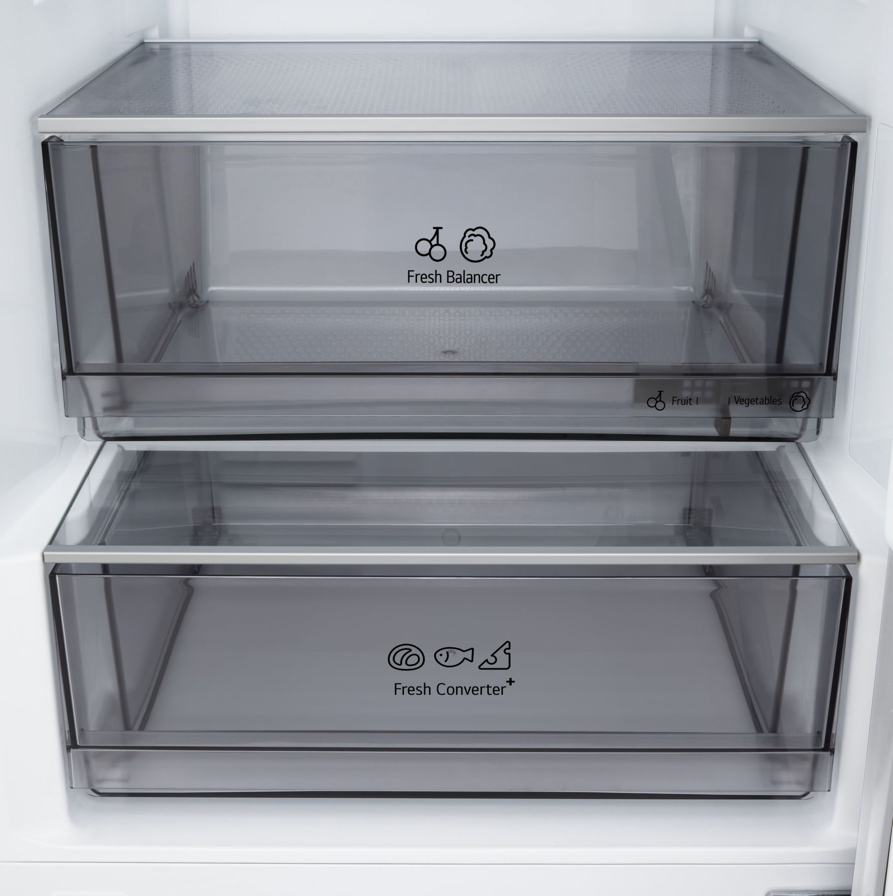 Холодильник LG GC-B509ETTM з нижньою морозильною камерою має загальний корисний об'єм 375 л (262 л холодильне відділення + 113 л морозильне). Пристрій оснащений інверторним компресором, системою Total No Frost, технологією DoorCooling+ та зовнішнім LED-дисплеєм. Зони Fresh Balancer і Fresh Converter дозволяють точно регулювати вологість і температуру для різних продуктів. Річне споживання енергії становить 263 кВт·год (клас E), рівень шуму - 35 дБ. Гарантія - 1 рік повна + 10 років на компресор.