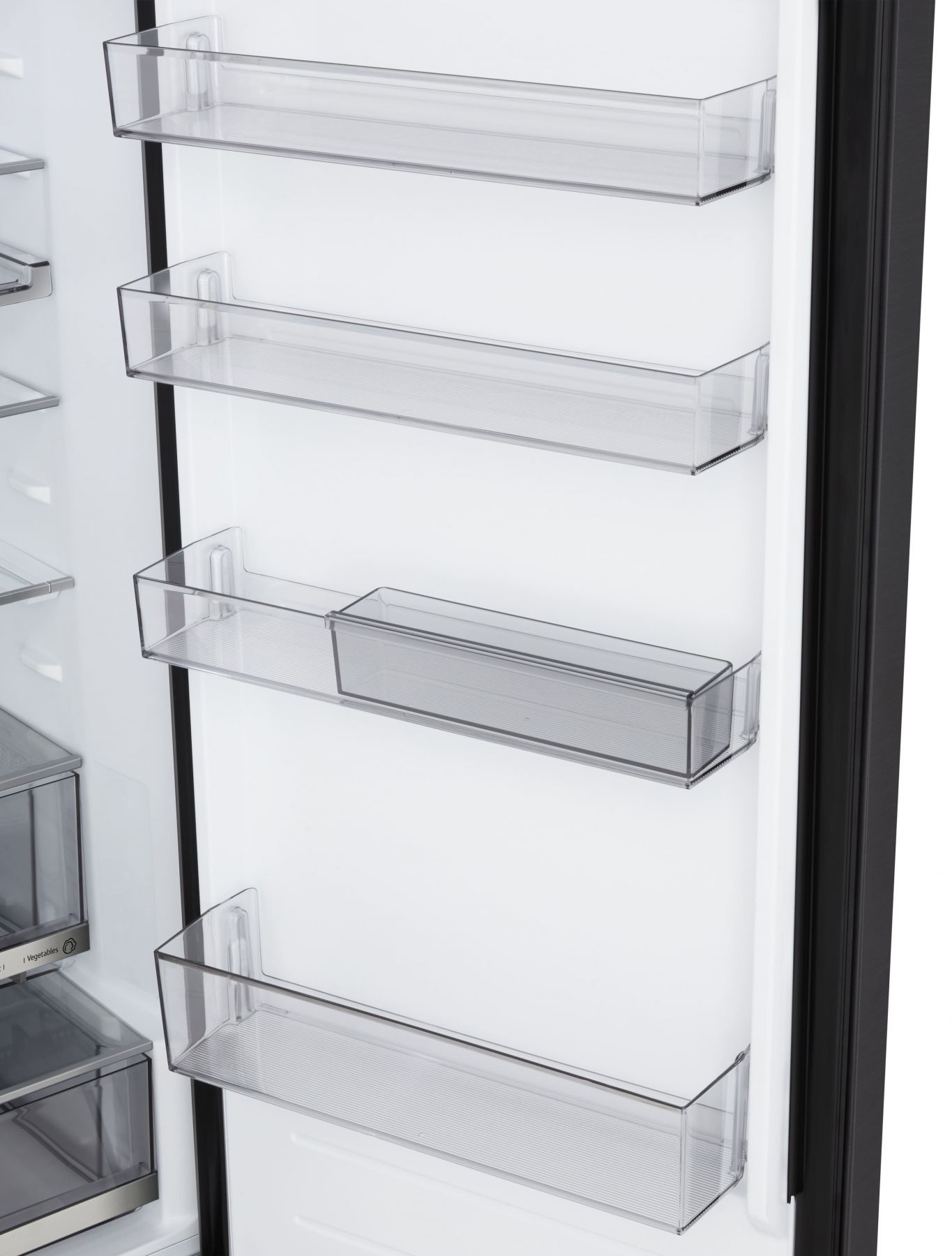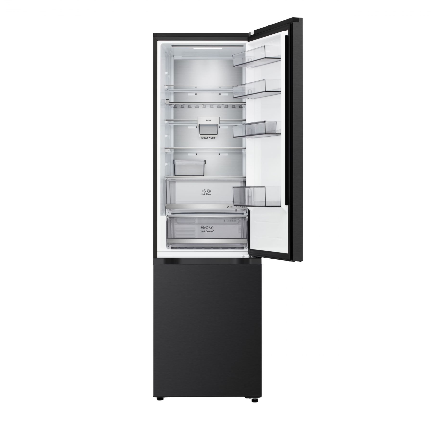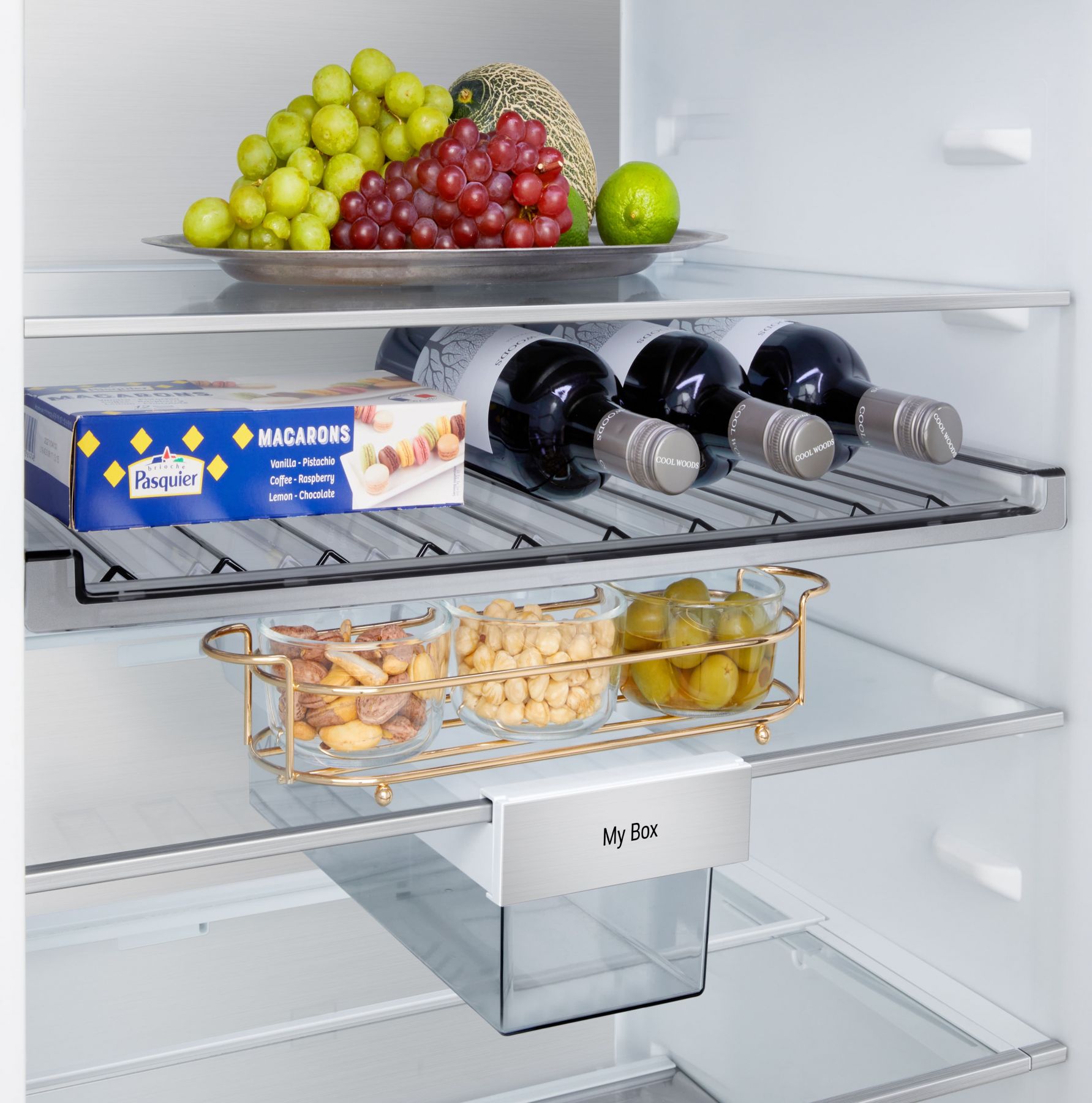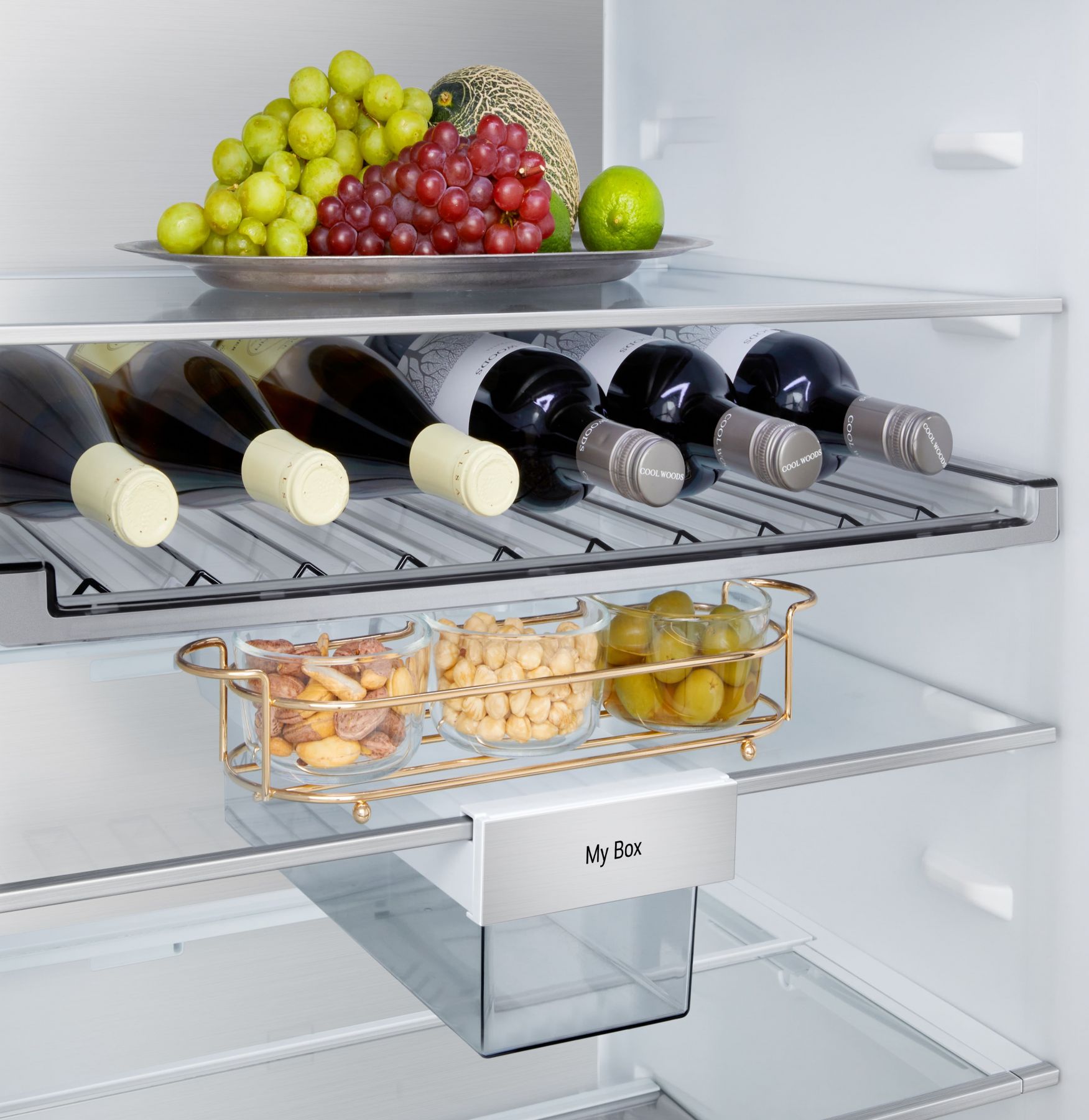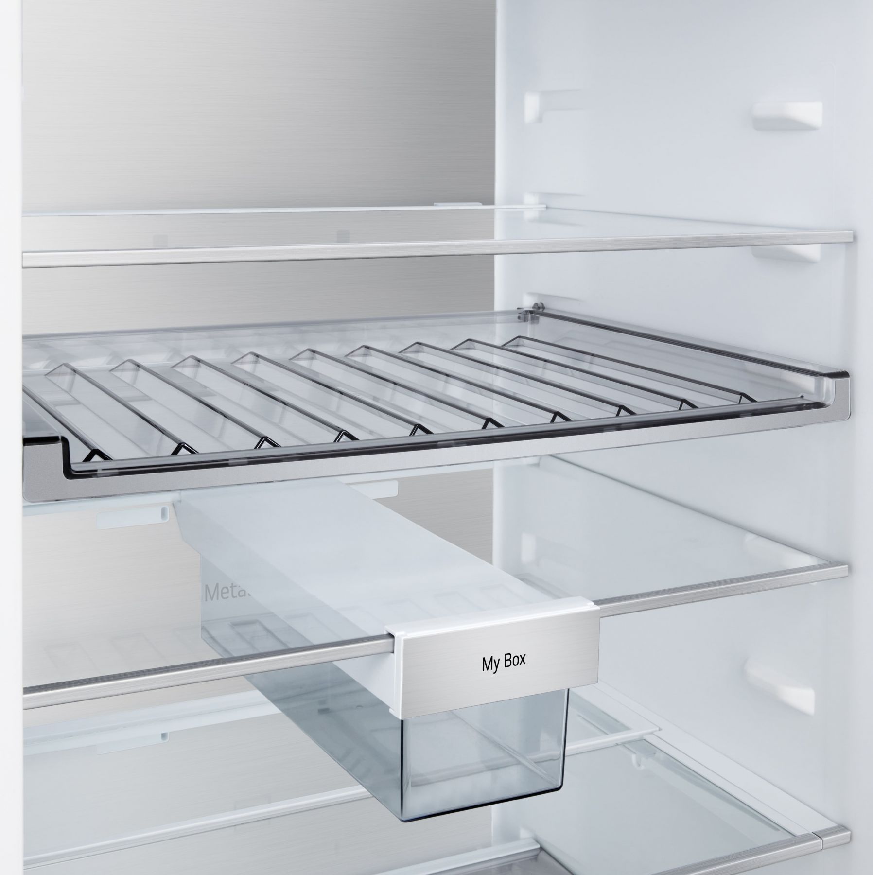 Додатково:Перевішування дверей, металеве декорування полиць та ящиків, нульовий зазор, лоток для заморожування льоду, винна полиця, складана полиця, пересувний кошик, міні кошик на дверцятах, висувний контейнер для дрібної їжі My Box, прозорі дверні кошики, висувні контейнери