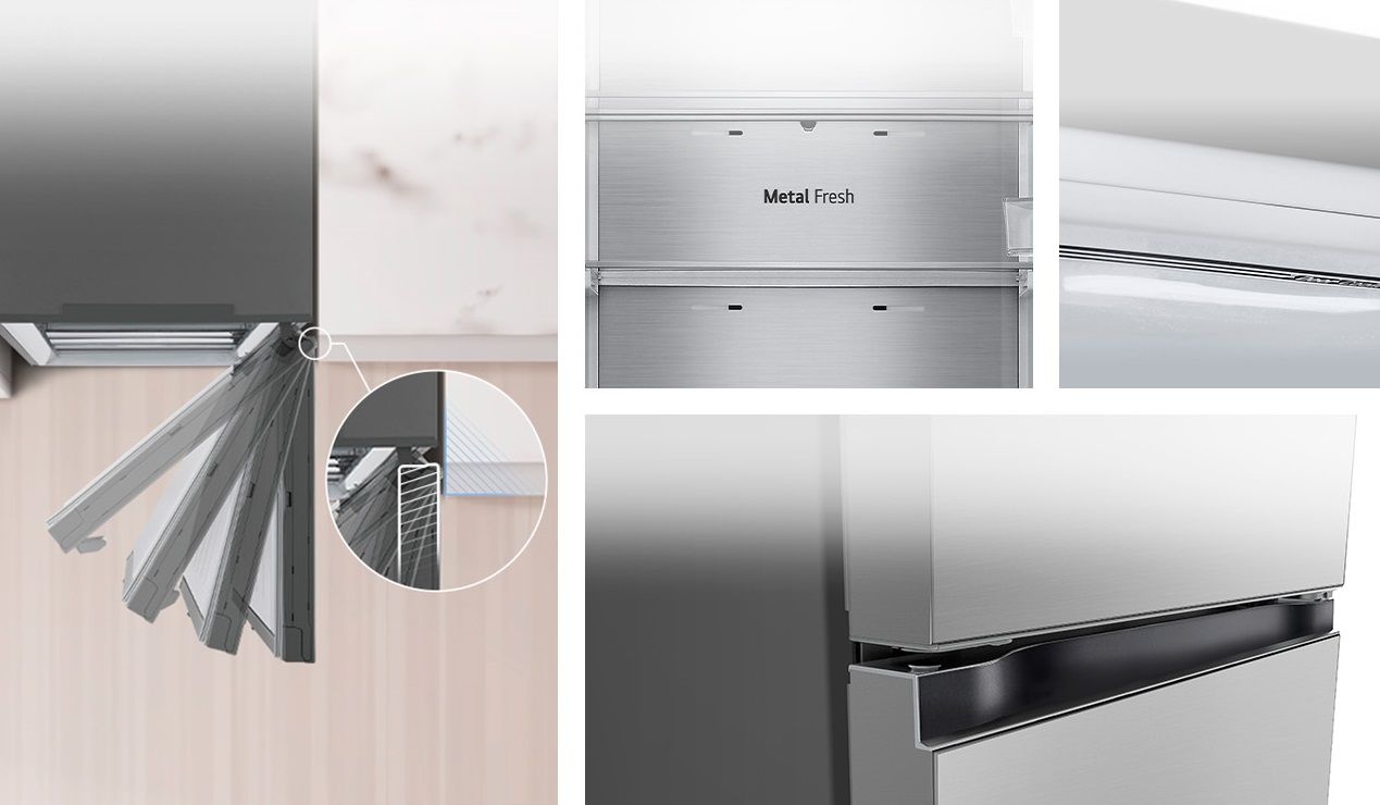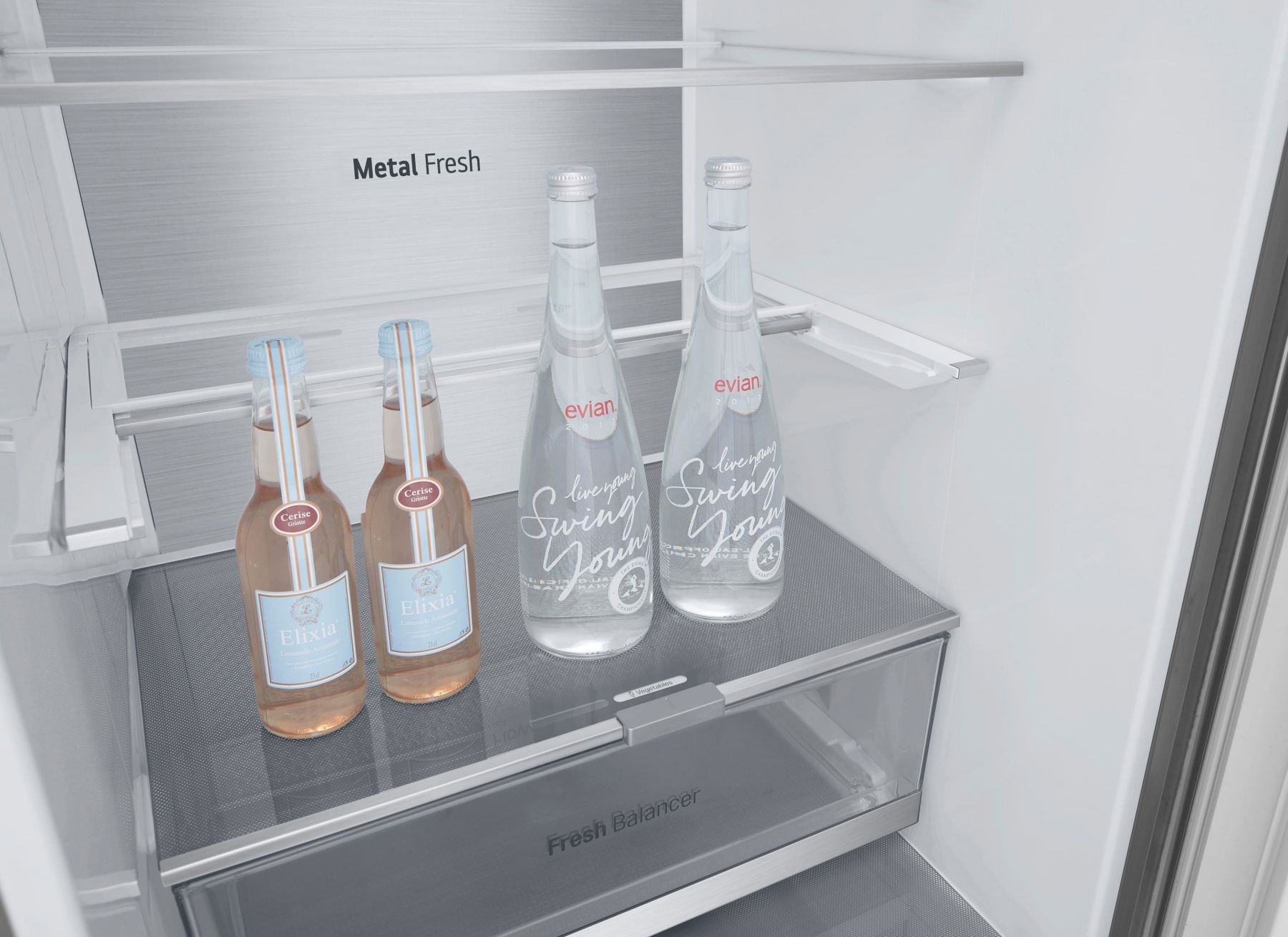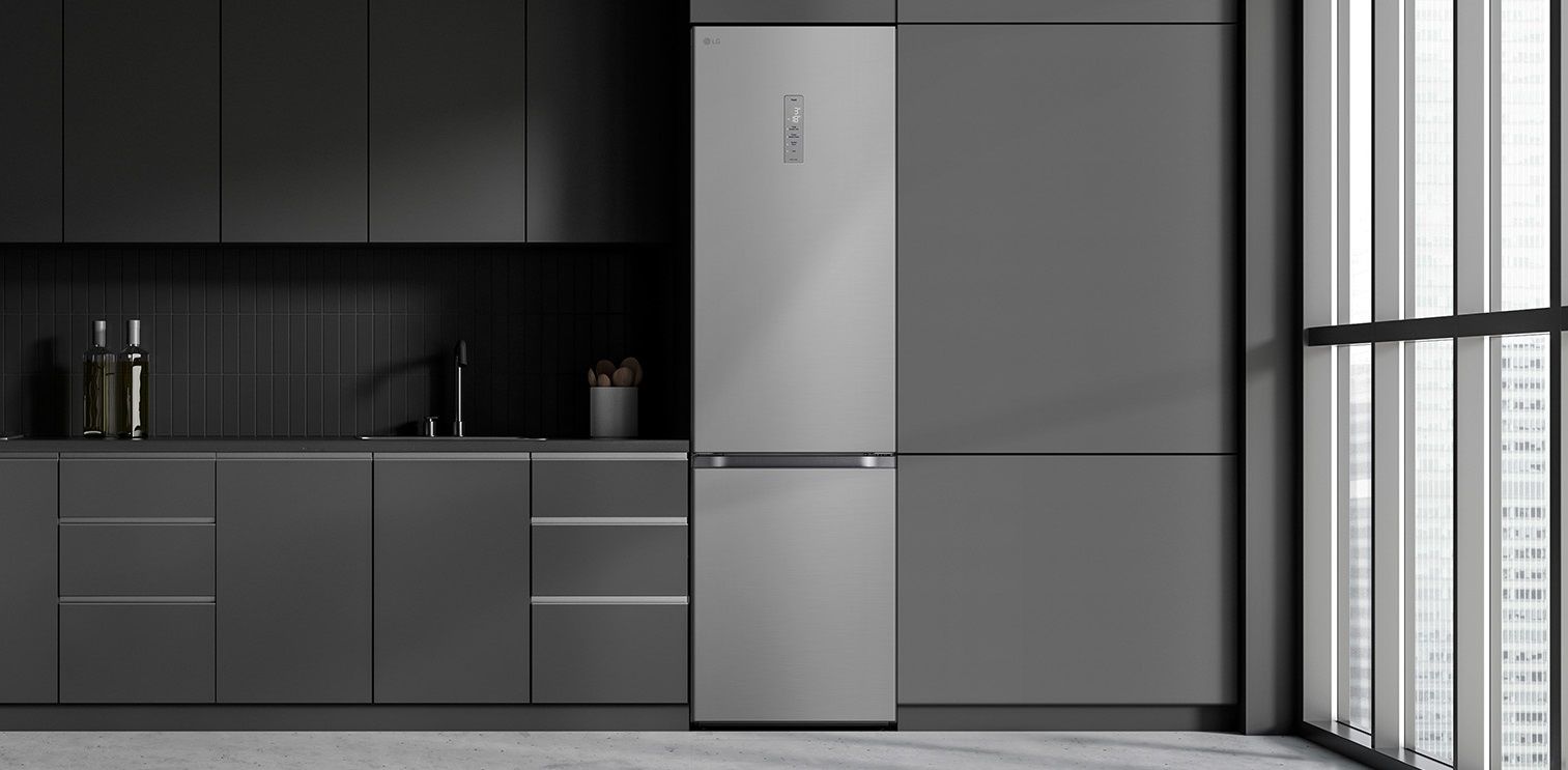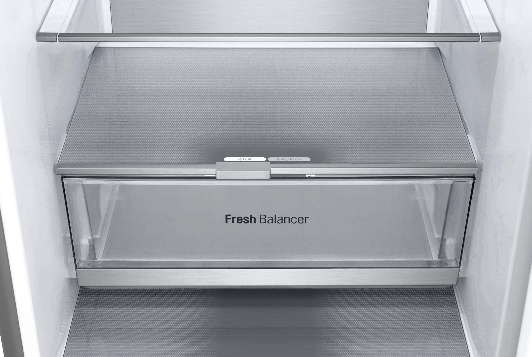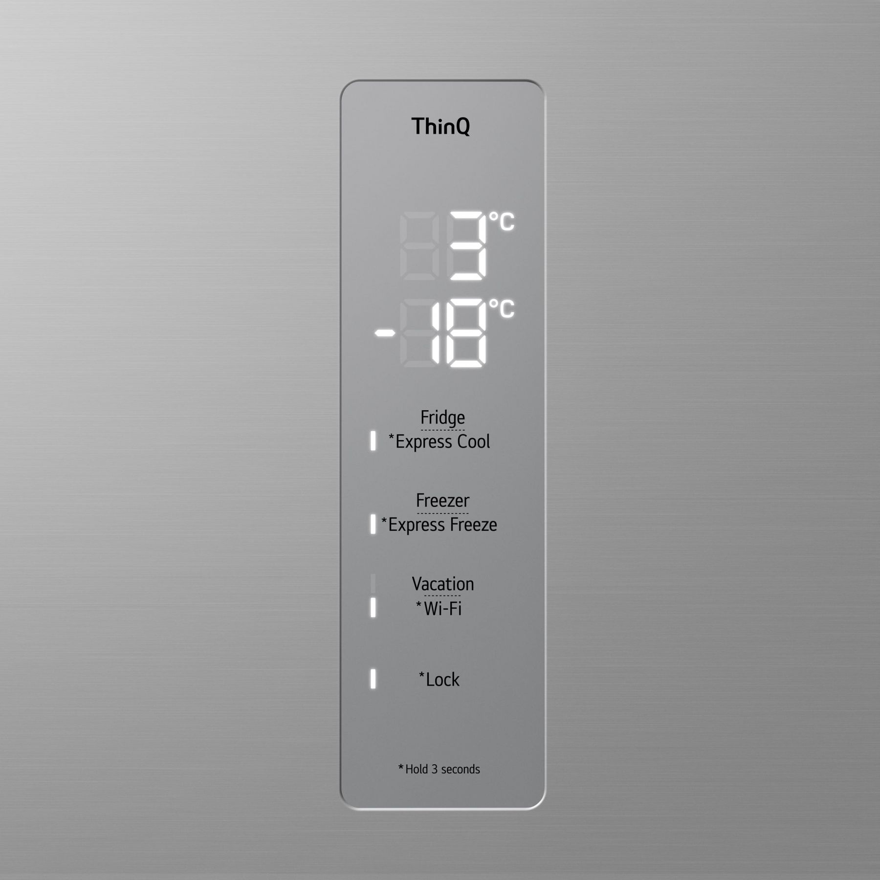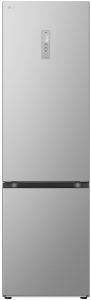 Сучасний холодильник з об’ємом 384 л, нижньою морозильною камерою на 107 л і тихою роботою (35 дБ). Інверторний компресор і технологія Total No Frost забезпечують ефективне охолодження без інею. Оснащений DoorCooling+, зонами свіжості Fresh Balancer і Fresh Converter, Wi-Fi-керуванням LG ThinQ, дисплеєм, LED-підсвіткою та складаною полицею. Енергетичний клас A++, споживання – 288 кВт/рік.