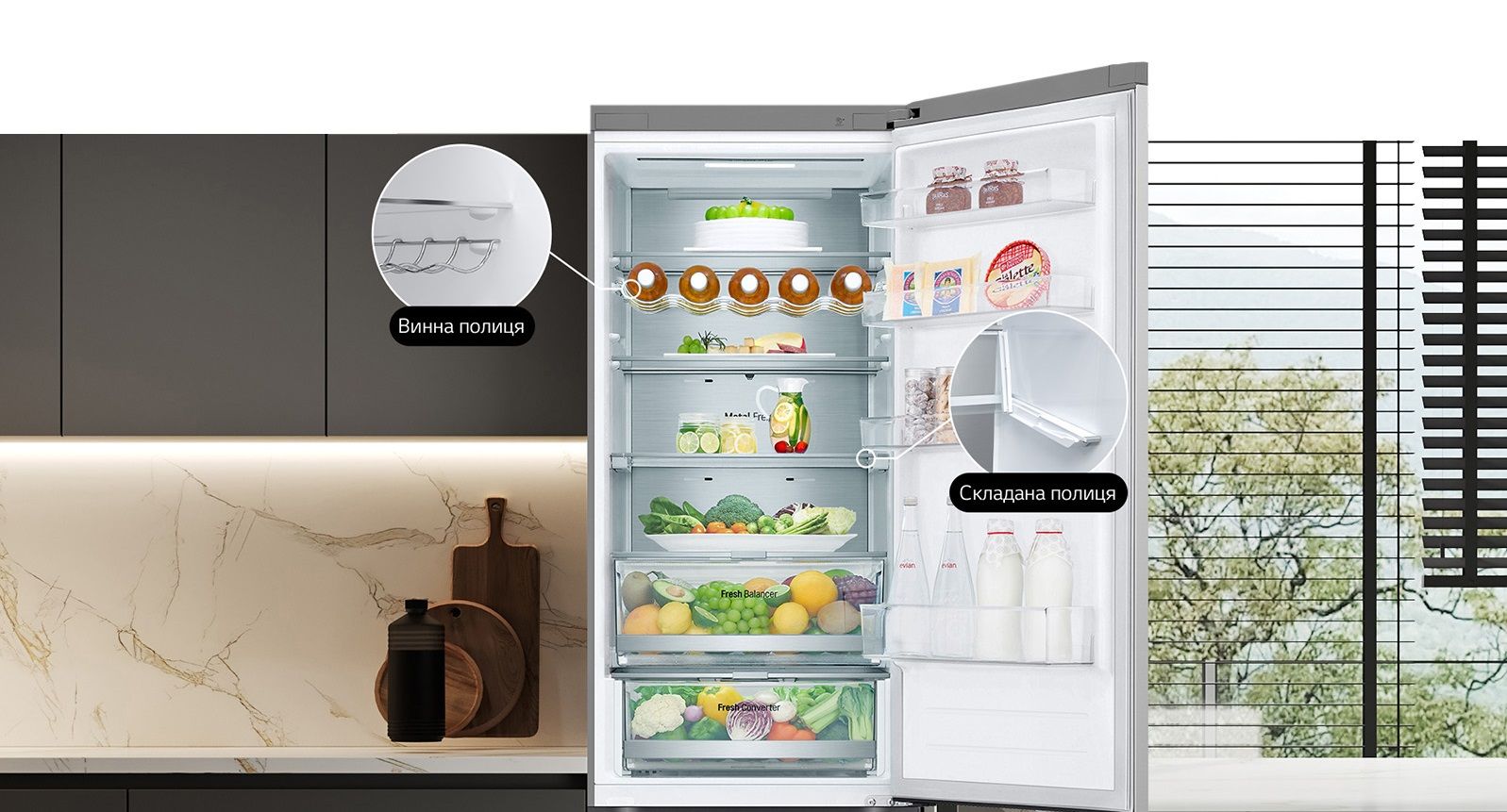 Функції / можливості:Експрес заморозка, Зона свіжості FRESH Balancer, Інтелектуальна система діагностики Smart Diagnostics, Зона свіжості FRESH Converter, Експрес охолодження, Багатопотокова система охолодження Multi Air Flow, Eco Friendly, DoorCooling+, Технология ThinQ, Wi-Fi керування, Сигнал відкритих дверцят, Metal Fresh, Технологія контролю напруги