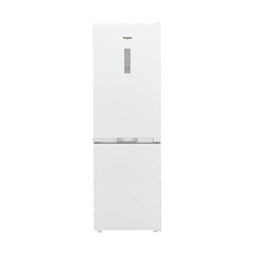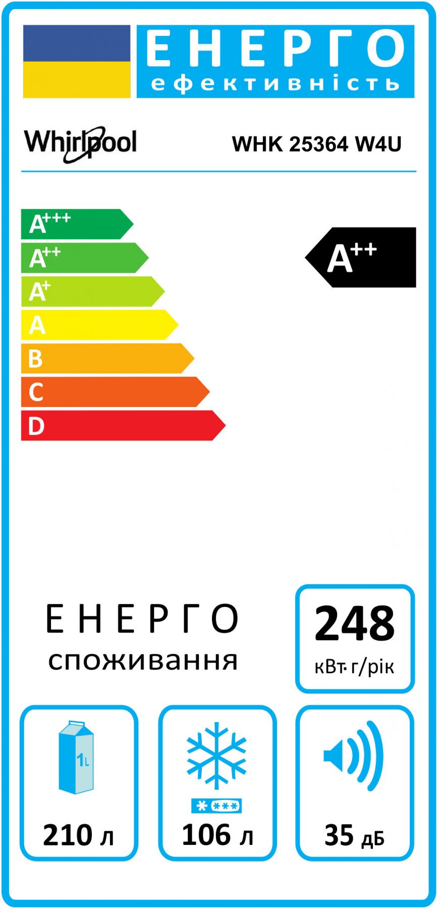 Холодильник Whirlpool WHK25364W4U з нижньою морозильною камерою, двокамерний, загальним об’ємом 316 л (210 л холодильне, 106 л морозильне), класом A++ та інверторним компресором. Габарити 186,5×59,5×66,3 см, рівень шуму 35 дБ, кліматичний клас SN-T. Система Dual No Frost для обох відділень, електронне керування з дисплеєм, прихованими ручками та сигналізацією відкритих дверей. У холодильному відділенні 3 скляні полиці, 3 дверні кошики, 2 контейнери для овочів, полиця для пляшок; у морозильному — 3 секції, потужність заморожування 6 кг/24 год, автономність 11 год.