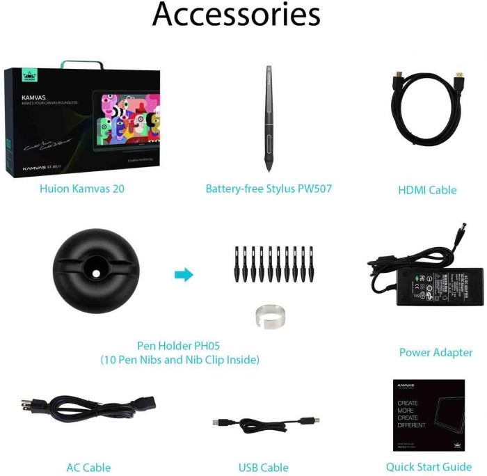 Комплектація:USB-кабель, адаптер живлення, Кабель HDMI, серветка для очищення, короткий посібник користувача, перо, затискач для наконечника пера, графічний дисплей