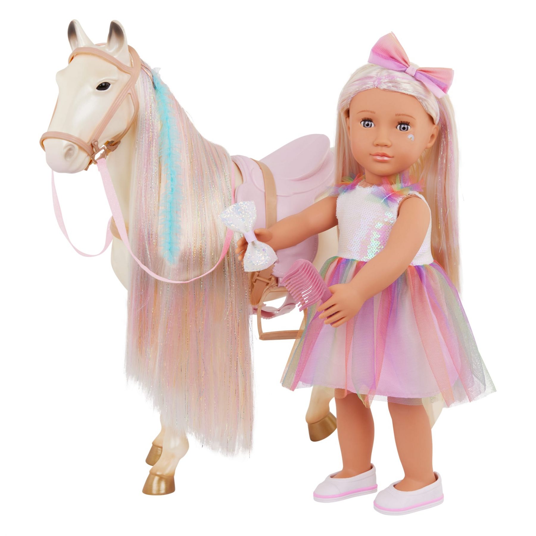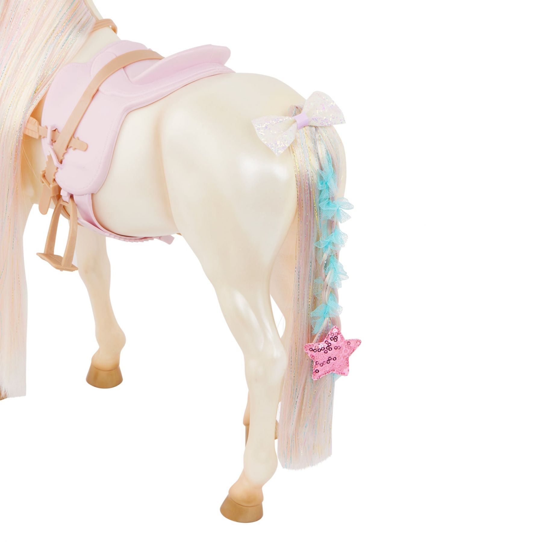 Пориньте у магічний світ пригод разом із Чарівним конем від Our Generation! Цей розкішний кінь заввишки 50 см ідеально підходить для ляльок Our Generation зростом 46 см, яких можна зручно посадити у яскраве рожеве сідло. Його надзвичайно довга грива та хвіст прикрашені веселковими блискітками, що додають магії кожній прогулянці.