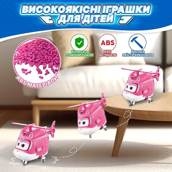 Ігрова фігурка-трансформер Super Wings Transforming Діззі відтворює персонажа анімаційного серіалу «Супер Крила: Електрогерої». Модель поєднує образ літака та робота з можливістю трансформації у 10 кроків. Конструкція розрахована на активну гру та багаторазове перетворення. Фігурка виготовлена з ударостійкого пластику та призначена для дітей від 3 років.