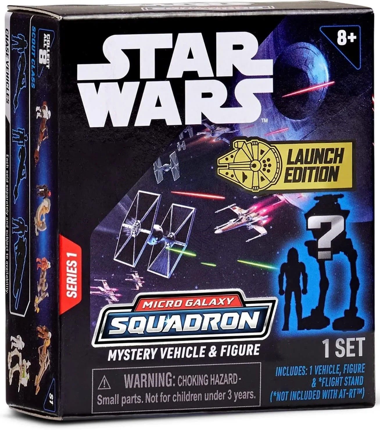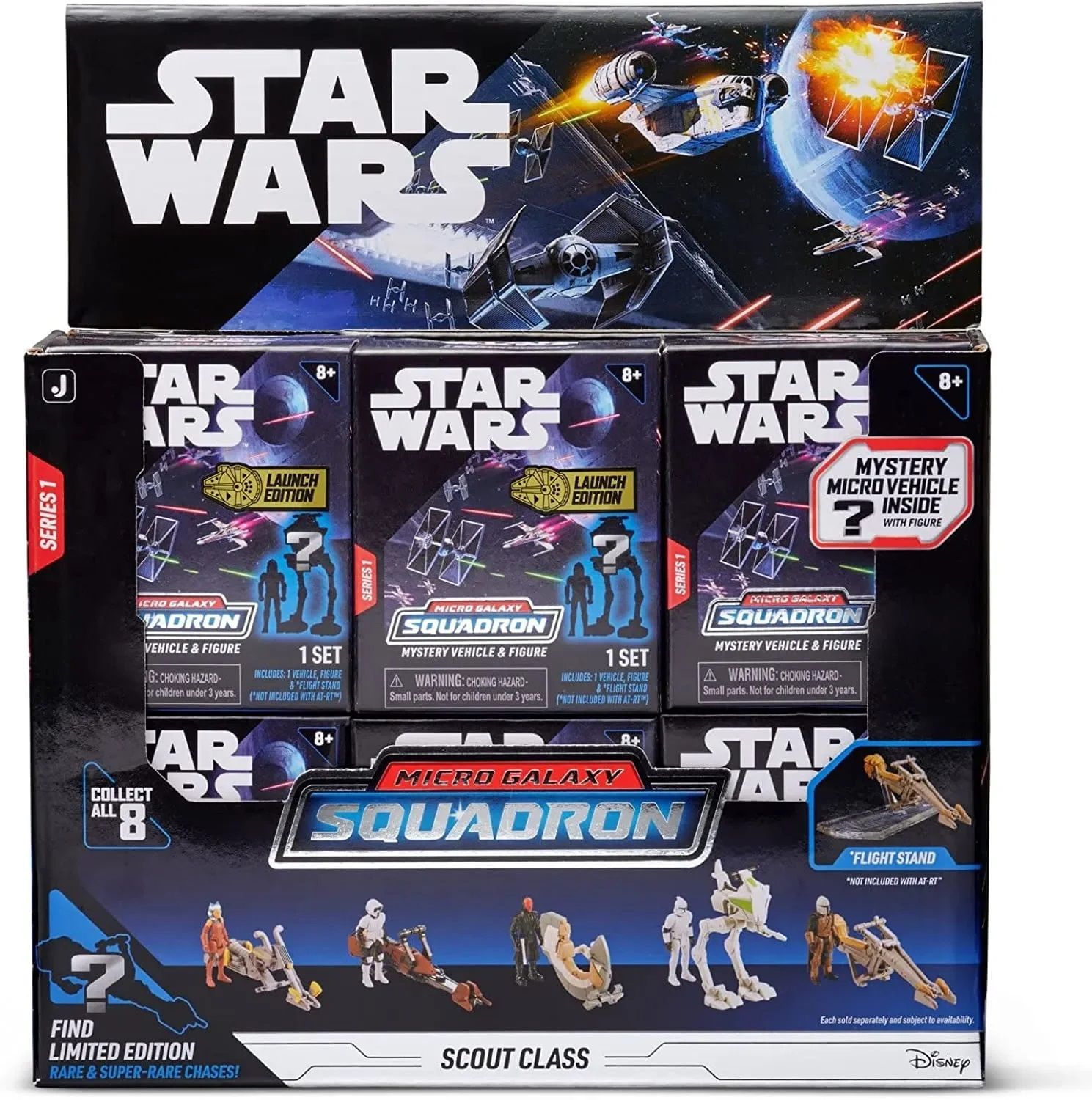 Зміцніть свій флот з іграшкою сюрпризом STAR WARS серії Micro Galaxy Squadron. Кожен бокс сюрприз в комплекті має 5 см зоряний транспорт Scout Class з підставкою та фігурку улюбленого персонажа з зоряних воєн Series 1: Speeder Bike (Endor) з Scout Trooper, The Mandalorian's Speeder з Din Djarin, AT-RT з Clone Trooper, FC-20 Speeder з Darth Maul, Speeder Bike з Remnant Scout Trooper & Grogu.