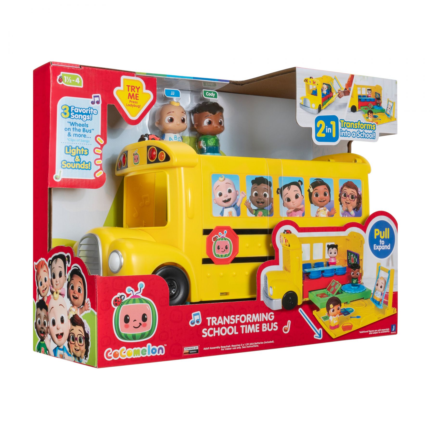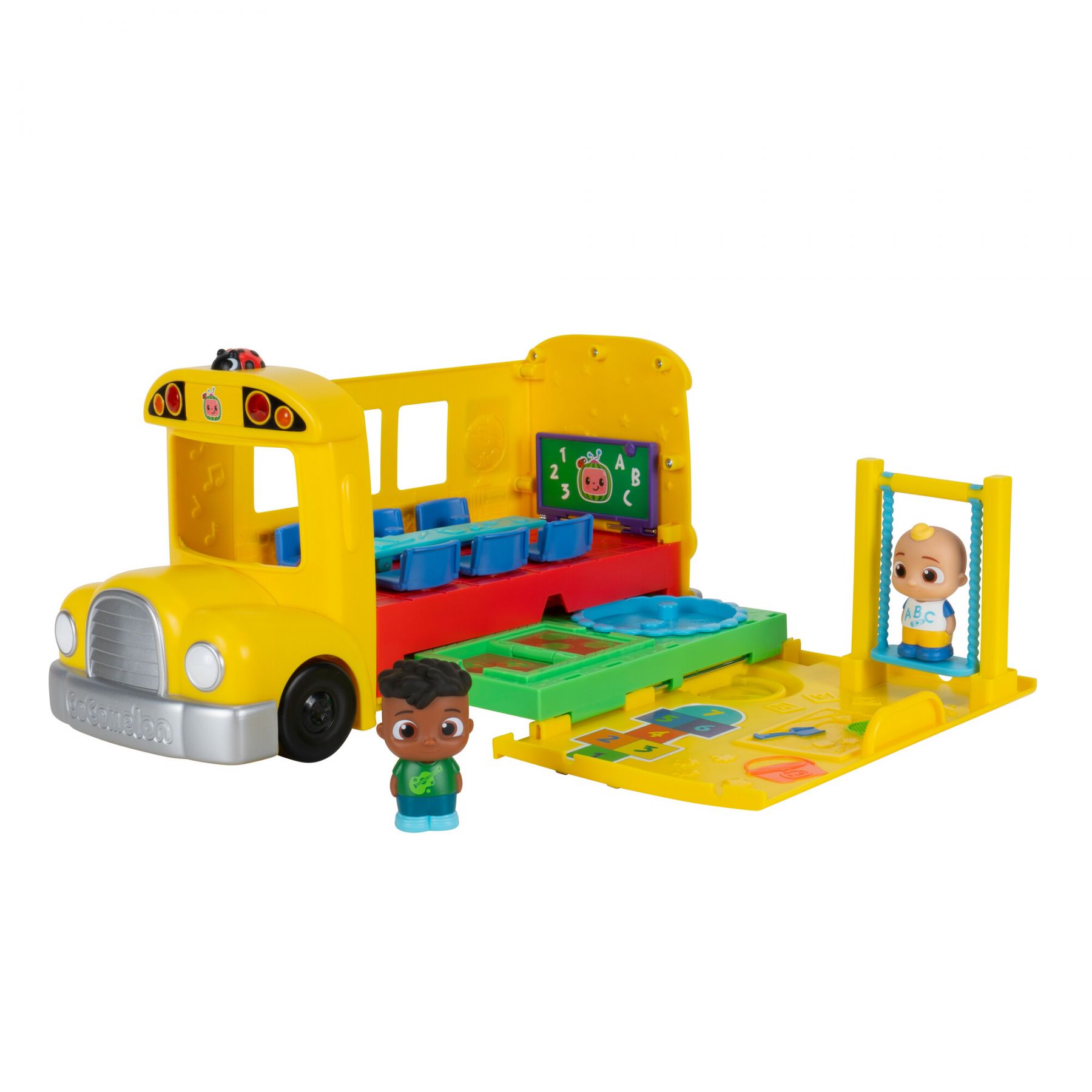 Приєднуйтеся до Джей Джея та Коді під час веселого дня в школі з CoComelon Transforming School Time Bus! Цей автобус-трансформер 2-в-1 містить 6 ігрових зон, включаючи класну кімнату та дитячий майданчик!