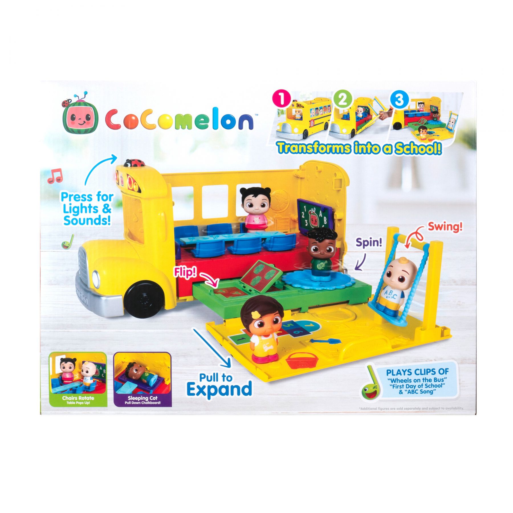 Особливості:звуковий супровід англійською мовою, Автобус може вмістити до шести друзів CoComelon (фігурки продаються окремо), Натисніть на сонечко, щоб активувати веселі звукові пісні та підсвітку