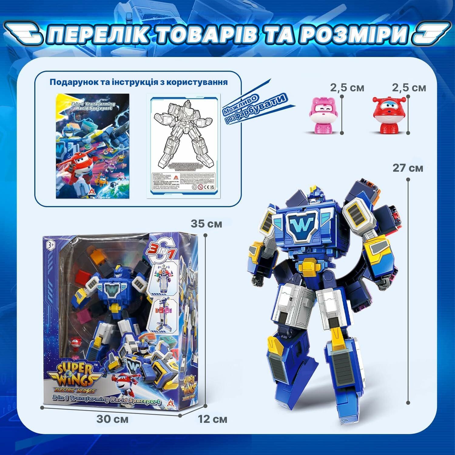 Ігровий набір Super Wings Transforming Всесвітній космодром 3в1 відтворює орбітальну базу World Spaceport із сезону «Супер Крила: Електрогерої». Конструкція трансформується у робота, космічний літак або всесвітній космопорт, забезпечуючи різні сценарії гри. Модель має рухомі елементи та комплектується двома колекційними мініфігурками. Іграшка виготовлена з ударостійкого пластику та не потребує батарейок. Рекомендована для дітей від 3 років.