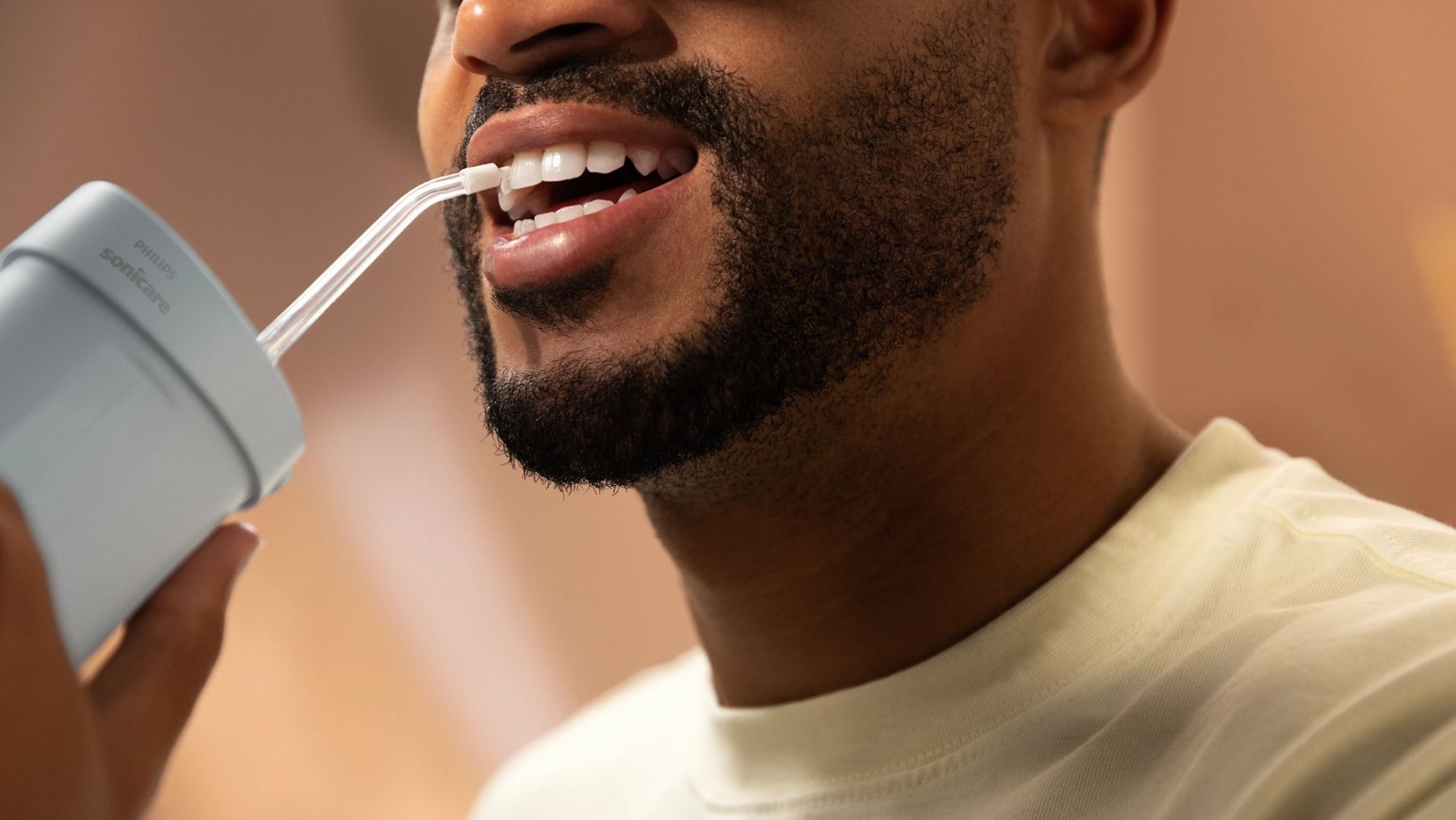Портативний іригатор Philips Sonicare Compact Flosser 1000 — складний, з резервуаром 200 мл. Має 3 режими (Pulse, Clean, Sensitive), 2 насадки N1 Standard і N2 Comfort з обертанням 360° та таймер-підказку кожні 15 с. Працює до 14 днів від акумулятора, заряджається через USB-A, водонепроникний за IPX7. Передбачено зберігання насадки й два способи наповнення.