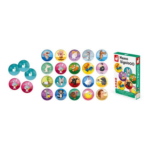 Розвиваюча настільна гра на розвиток уважності та пам’яті «Ріголо» французького виробника Janod. У комплекті: інструкція та 2 набори по 20 карток (6,5 х 6,5 см) із зображенням тваринок, що поєднуються у 20 пар. Грати можуть один, двоє і більше гравців, а переможе той, хто назбирає більшу кількість пар зображень. Можна грати всією родиною. Мемо гра «Ріголо» направлена на розвиток уваги, пам’яті, візуального сприйняття та логіки. Рекомендований вік: 3+