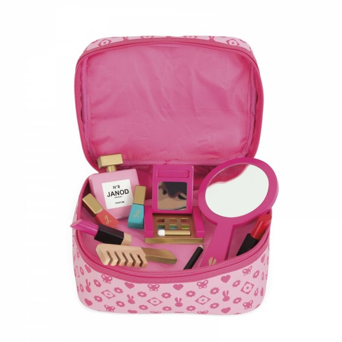 Дівчата ще з раннього віку бажають бути схожими на своїх мам. Їх приваблює їх косметика та різноманітні дрібнички. Тому французький бренд Janod створив яскравий, цікавий і, головне, безпечний набір маленької леді. У комплекті 9 дерев’яних елементів: велике дзеркало, палітра для макіяжу з дзеркальцем та пензликом, 2 помади, 2 лаки для нігтів, олівець для очей, пляшечка парфумів та гребінець для волосся. Такий набір привчатиме дівчат до охайності та вмінню доглядати за собою. Усі складові зберігаються у косметичці із текстилю. Для дітей від 3-х років.