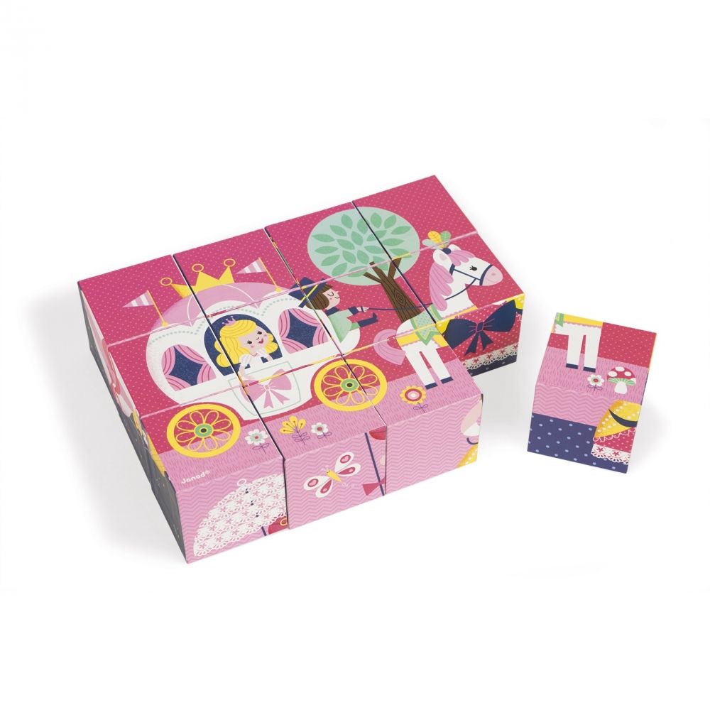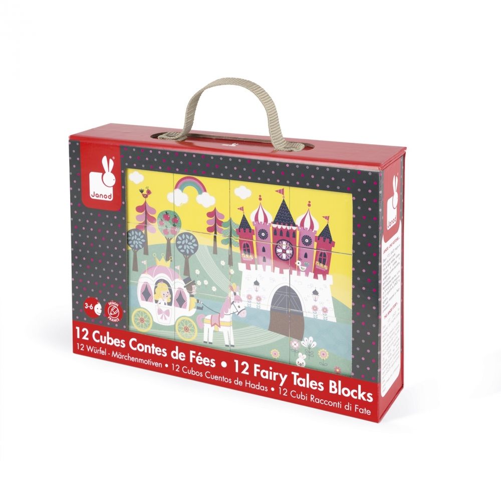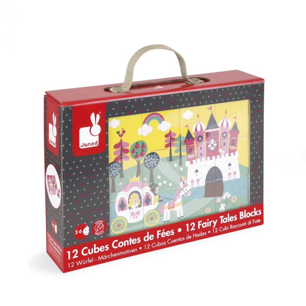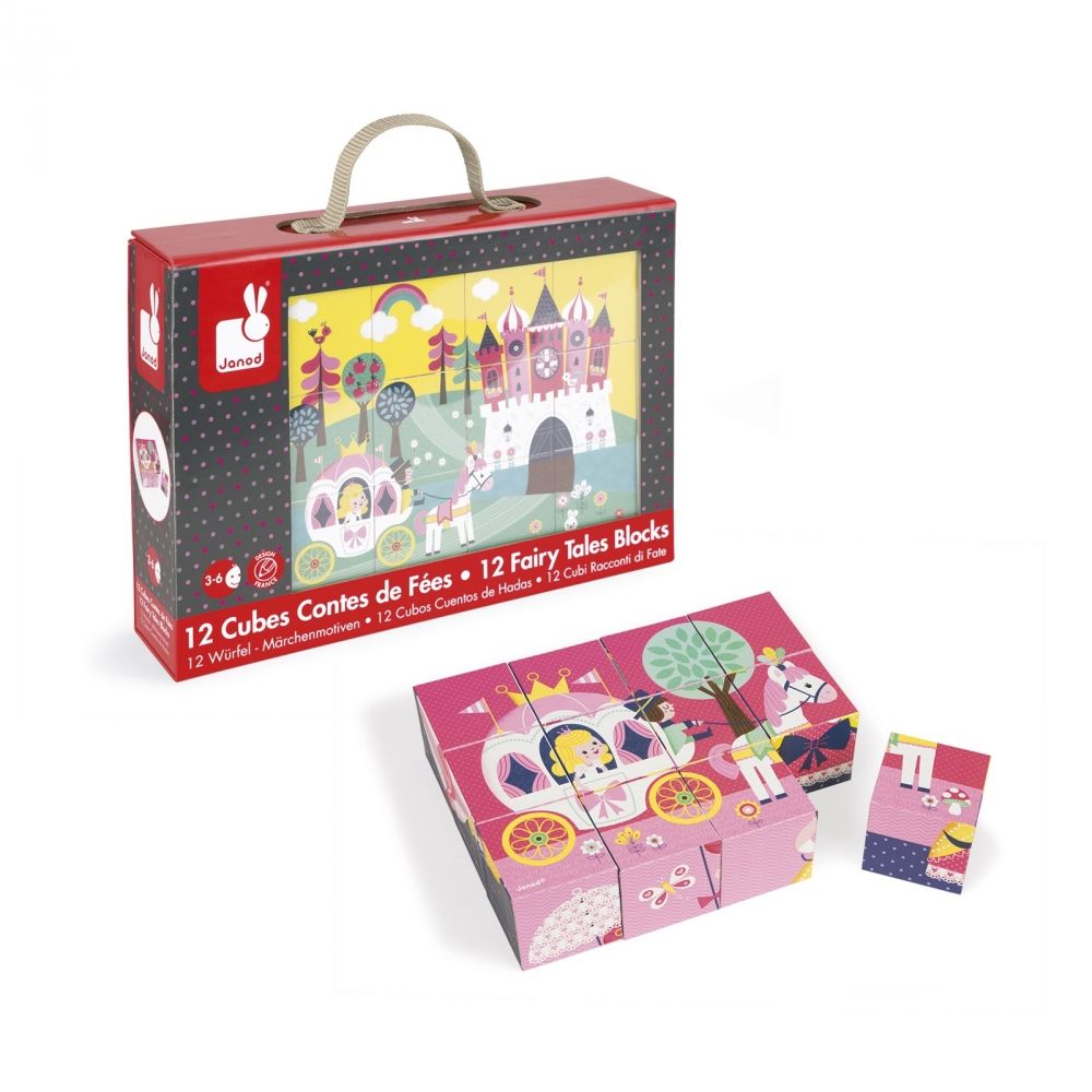 Чудовий набір розвиваючих кубиків від Janod неодмінно сподобається маленьким леді. У наборі 12 кубиків, на кожній з його сторін є частинка зображення. Всього можна зібрати 6 зображень на тему «Пригоди Попелюшки». Збираючи пазл із кубиків, дівчата розвиватимуть зорове сприйняття, пам'ять, логічне мислення та моторику рук. Кубики вироблені із цупкого картону, зображення на них яскраве і привабливе. Розмір одного кубика 5 х 5 см. Набір постачається у стильній картонній коробці із зручною ручкою. Для дітей від 3-х років.