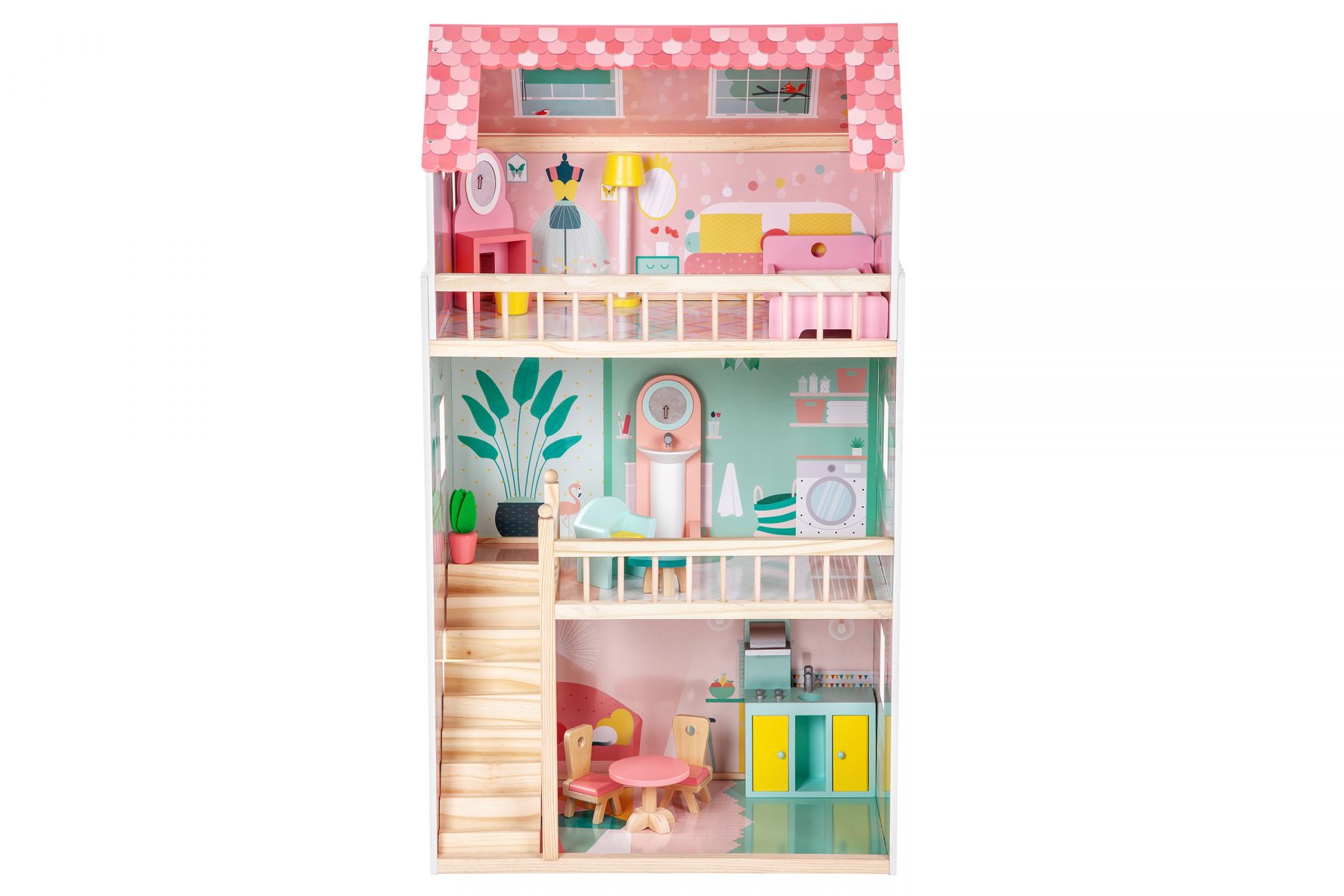 Фантастичний 3-поверховий будинок для ляльок, гармонійно прикрашений різноманітними меблями. Дах "зрізан" з одного боку, щоб легко було грати на останньому поверсі. Будинок сумісний з ляльками приблизно 30 см у висоту. Обладнаний дерев'яними сходами. 12 предметів меблів включені. Доставлений не зібраний.