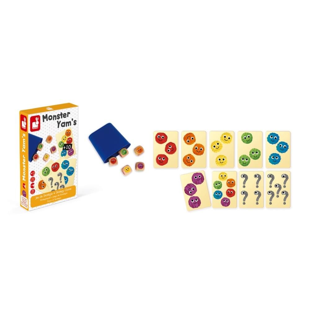 Захоплива гра в кості від Janod, адаптована для дітей від 5-ти років. На гранях гральних костей зображені різнокольорові милі монстри. Гра розрахована на 2-5 гравців, кожен обирає собі колір. Для перемоги у грі, необхідно зібрати найбільше балів. Гральні картки вироблені із цупкого картону, а кості із натурального дерева. Дизайн карток сучасний, а кольори привабливі. Діти розвиватимуть математичні навички, пам'ять, сприйняття кольорів.